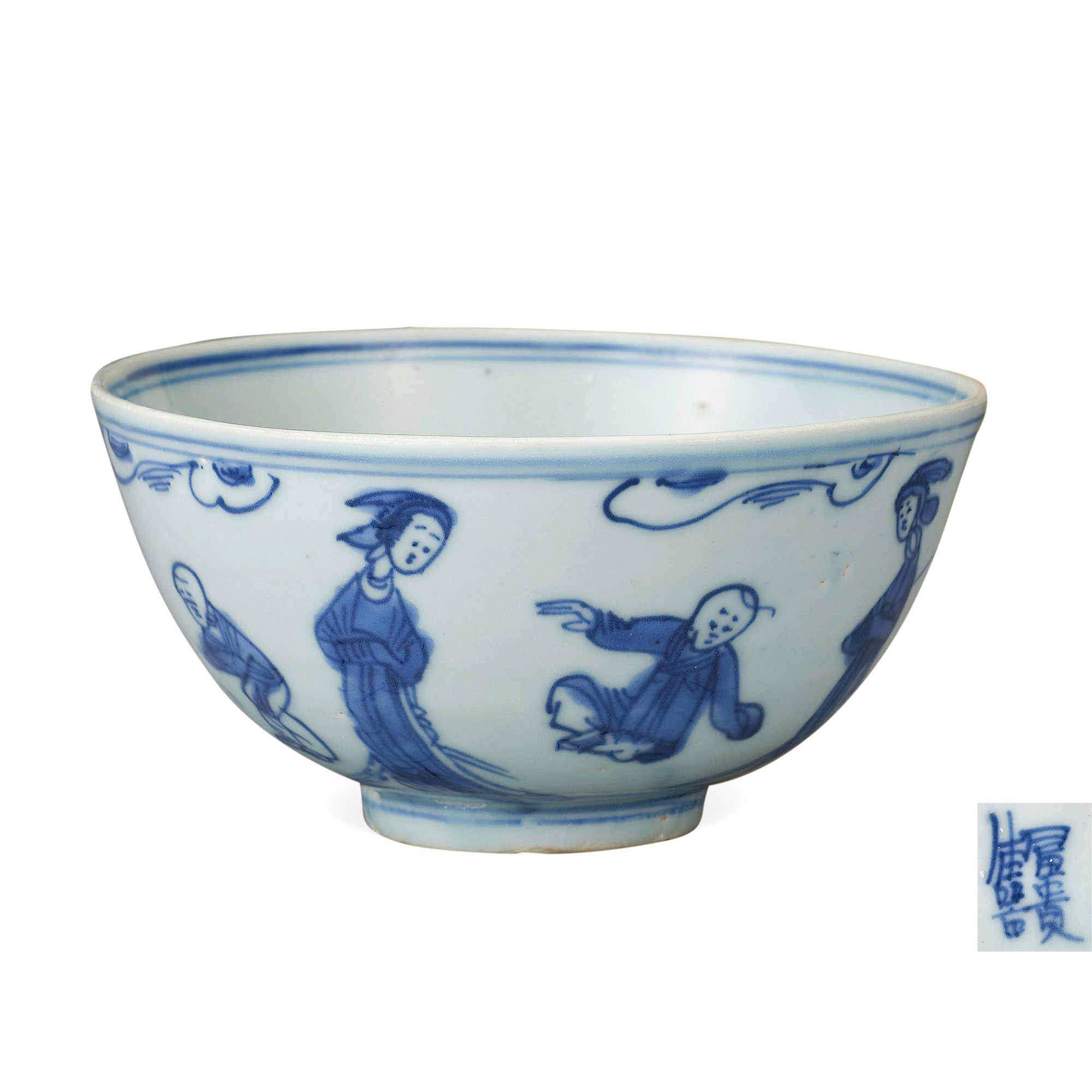 箱書:明染付婦童圖碗 竹世  印:竹世 高台内「富貴佳器」銘