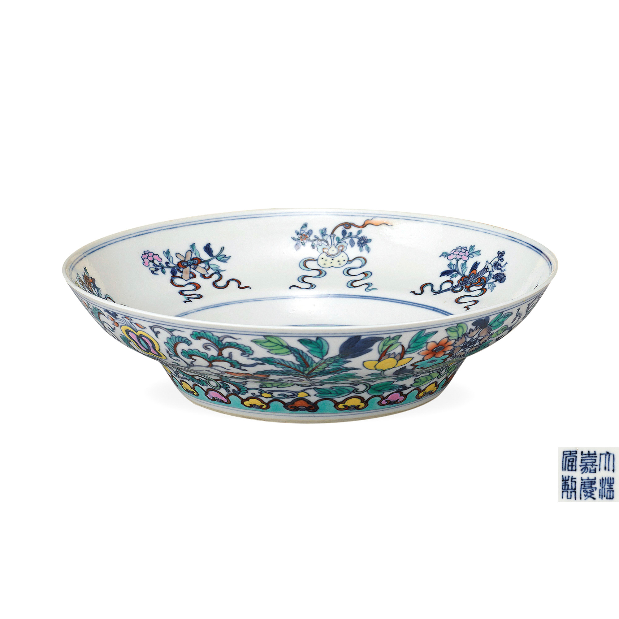箱書:清嘉慶 鬥彩八寶紋缽 竹世 印:竹世 高台内「大清嘉慶年製」銘
