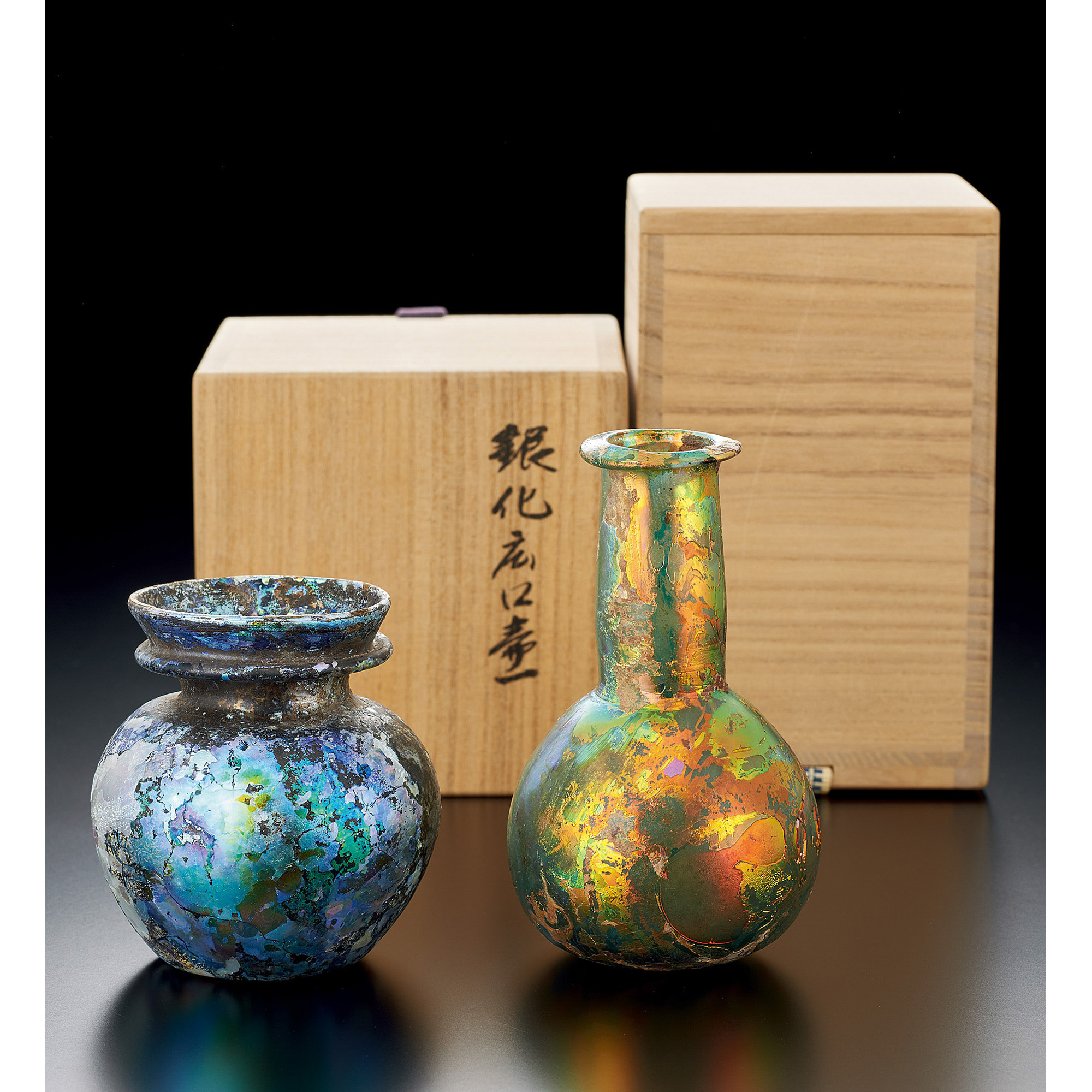 ローマングラス金銀化壺2点(加藤卓男識箱)
