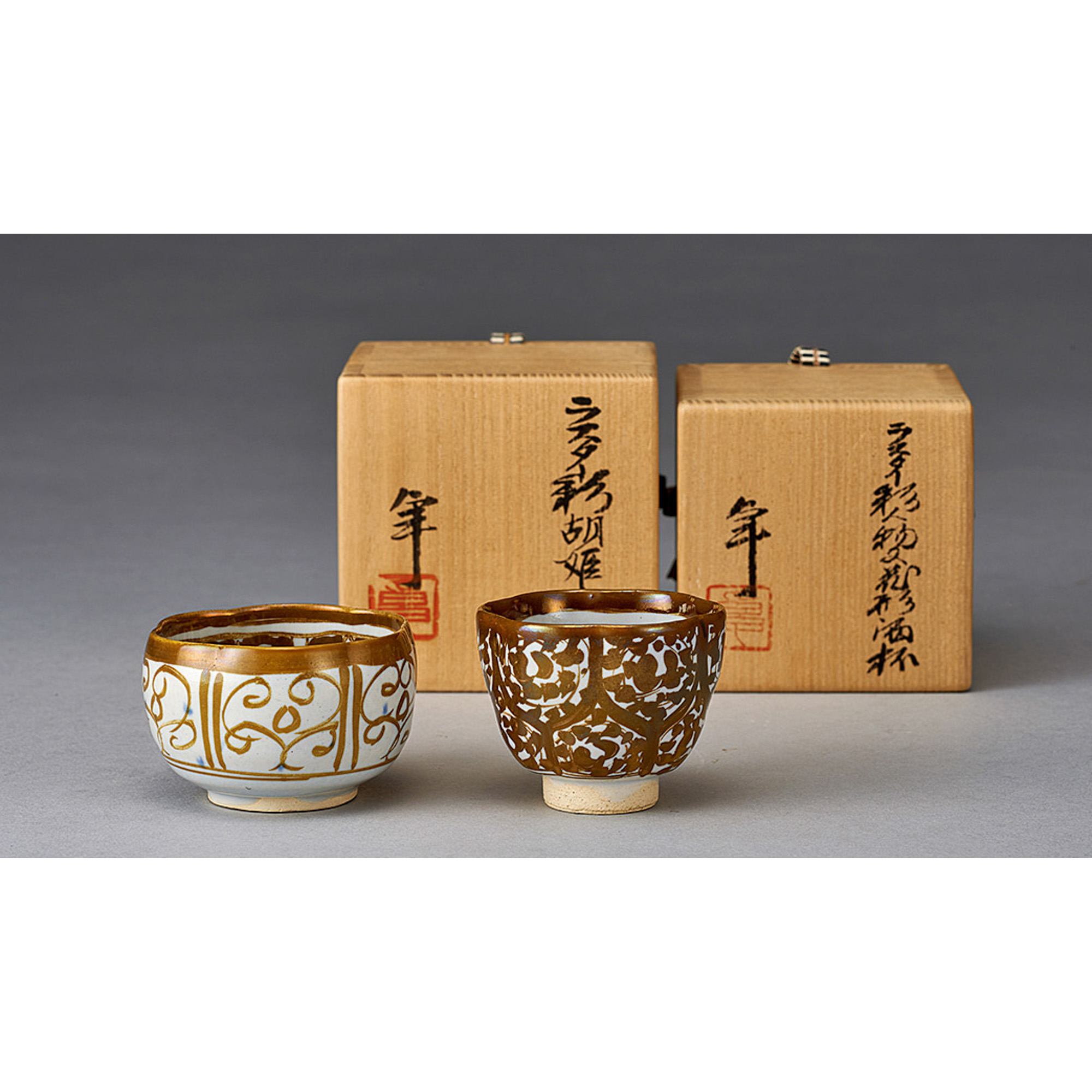 加藤卓男 ラスター彩胡姫紋人物紋花形酒杯2点(共箱)