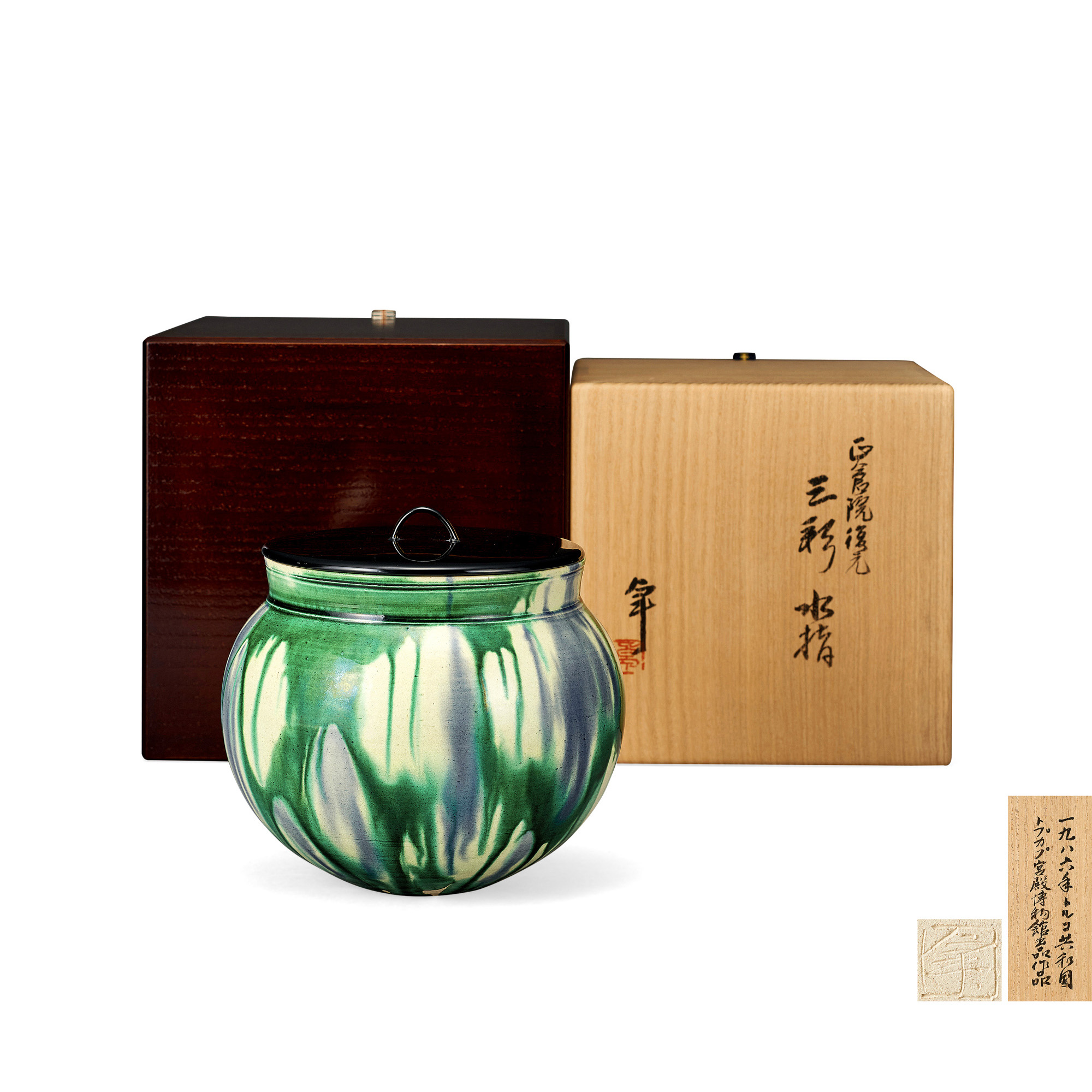 箱書:正倉院復元三彩水指 卓 一九八六年トルコ共和国トプカプ宮殿博物館出品作品 高台内「卓」銘