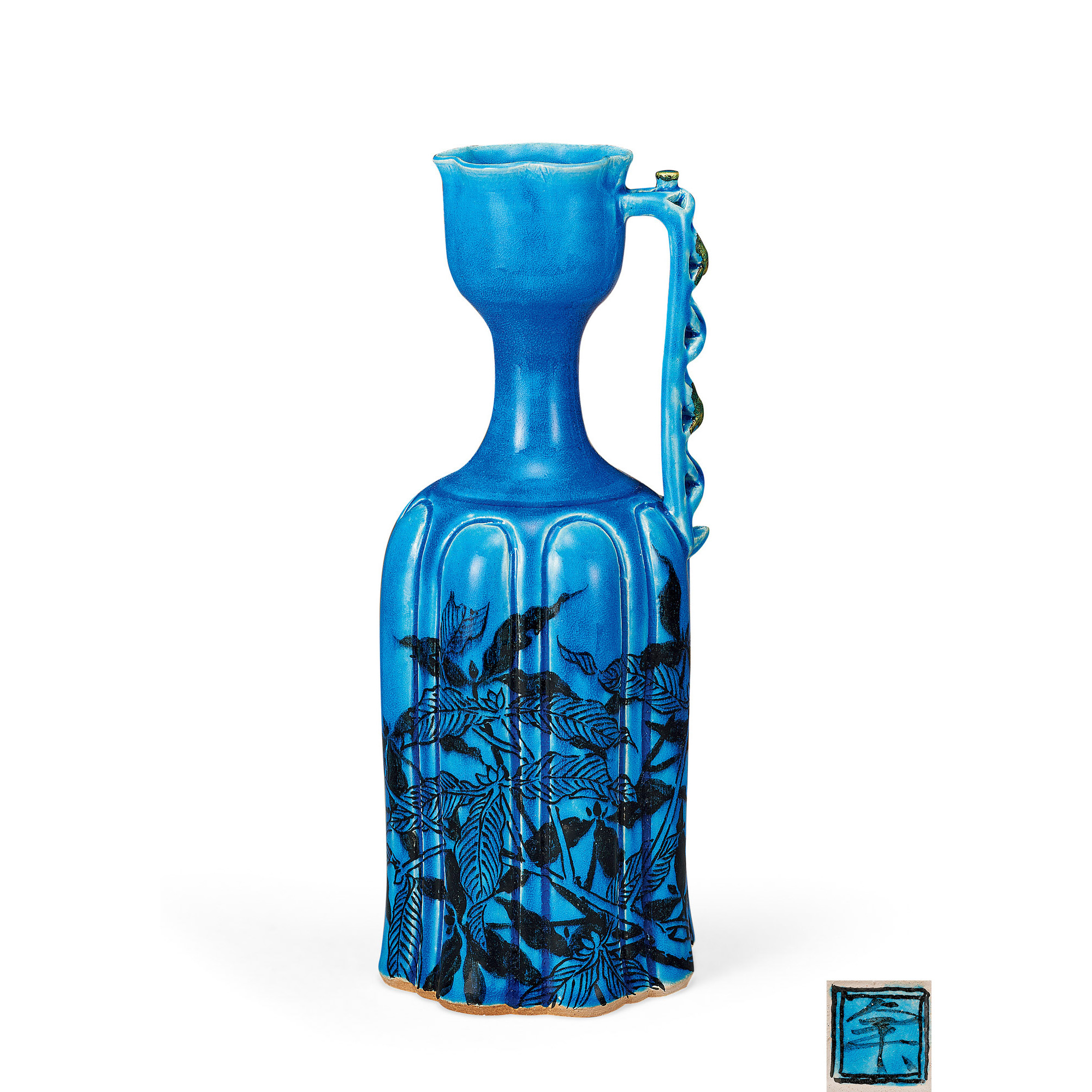 箱書:青釉草紋手付花入 卓 高台内「卓」銘
