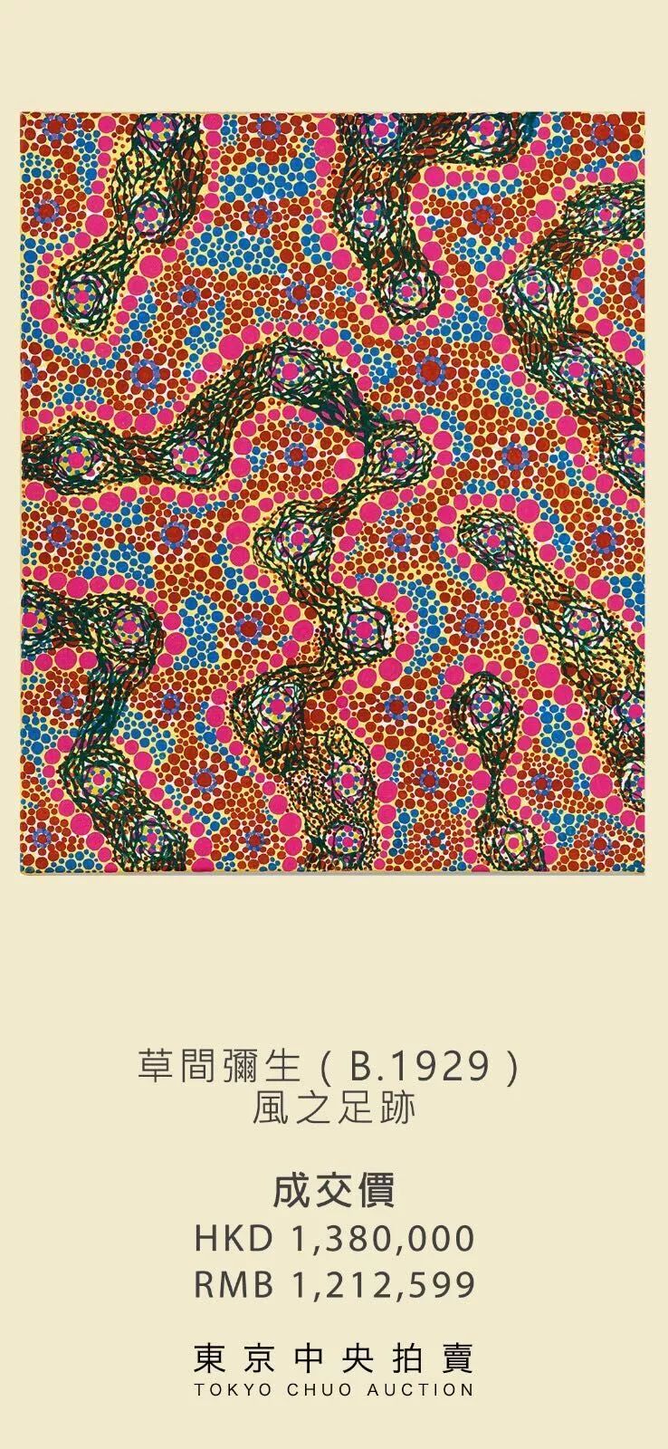 此次「當代藝術潮玩」專場共推出151件拍品,其中包括現今流行的新潮玩具、現當代藝術家作品、限量版愛馬仕手袋等,近八成拍品成交,成績理想。其中,日本殿堂級藝術家草間彌生的《風之足跡》廣獲熱捧,一開拍價格便連連上升,最終以港幣1,380,000成交。當代藝術潮玩已成流行趨勢,當今人們更願意將藝術帶入生活,為生活增添趣味。此外,東京中央拍賣更是推出私洽服務,包含限量版愛馬仕手袋,名貴珠寶手錶。