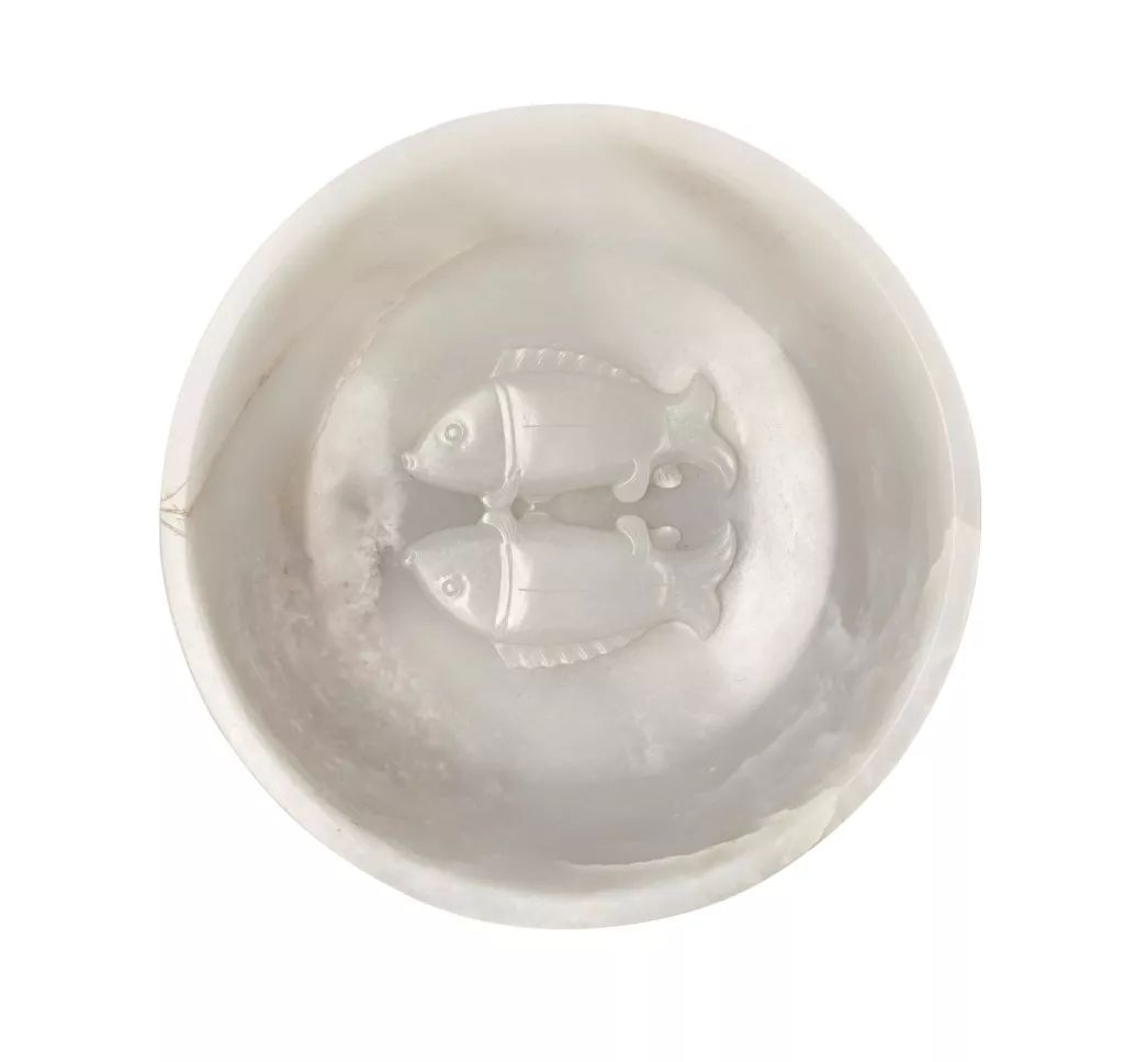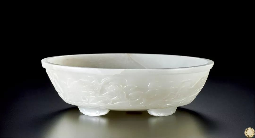 此洗以整塊玉料雕製而成,用料奢侈,玉質潤澤,器型形制規整,侈口,弧壁,折沿,下承四足。外壁浮雕纏枝蓮紋,蓮葉寬大飽滿,蓮花婀娜多姿,繁茂華美。洗內壁光滑,碗心浮雕雙魚紋,魚也是傳為佳話的祥瑞紋飾,「魚」與「余」同音,意為富貴有餘,吉慶祥和。正件作品選材厚重、玉質堅致細密,潔白溫潤,雕工精美,紋飾吉祥,且帶有英國著名老牌古董商 布鲁特父子商行(Bluett & Sons)標籤,實為不可多得的玉雕精品。