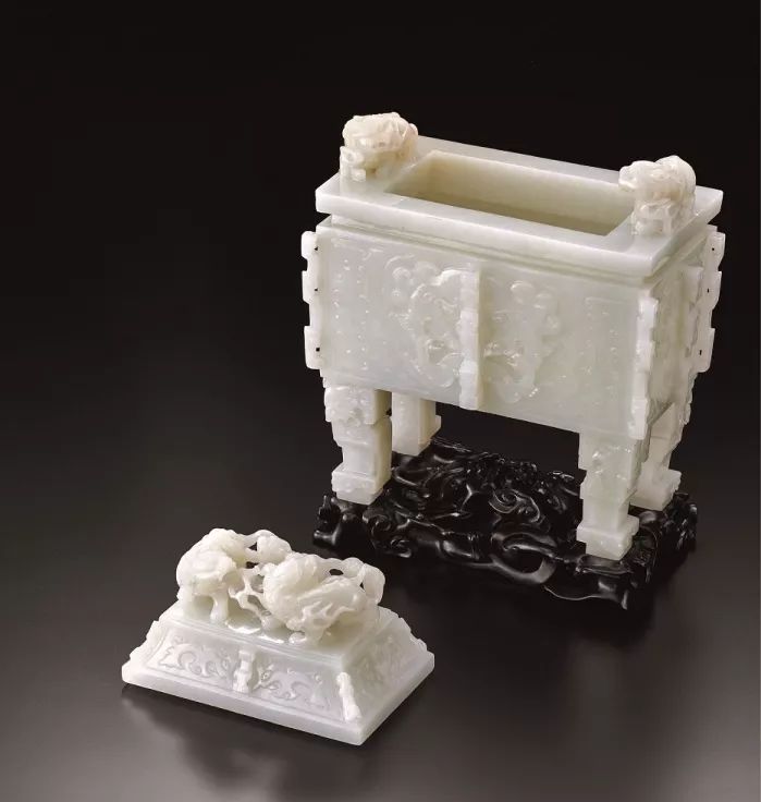 乾隆帝嗜玉如命,用了大量精美的白玉雕造各種類型的器物,以供清宮內賞玩陳設。且乾隆皇帝的復古之風盛時,以不同質料,不同工藝技法製成許多仿古之器物。大部分以商周漢唐器物為模,並且多配以原狀原坐,有托、架、基座。此香爐造型沉穩端莊,用料奢華,雕刻工藝精湛,古樸似拙,卻精巧絕倫,乃不可多得的玉器精品。