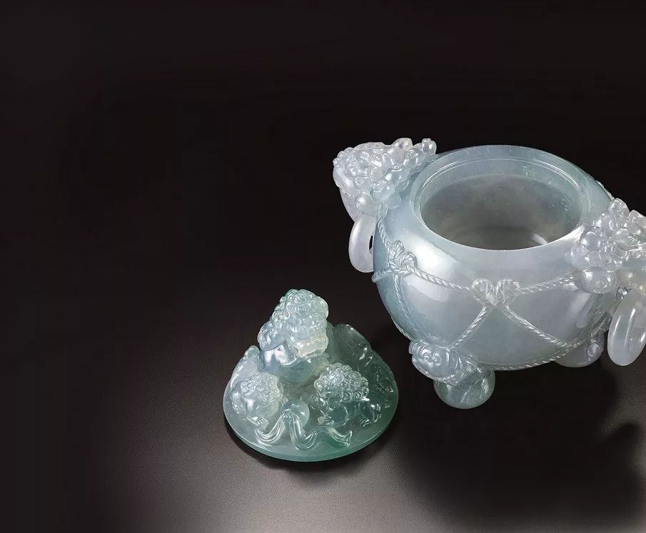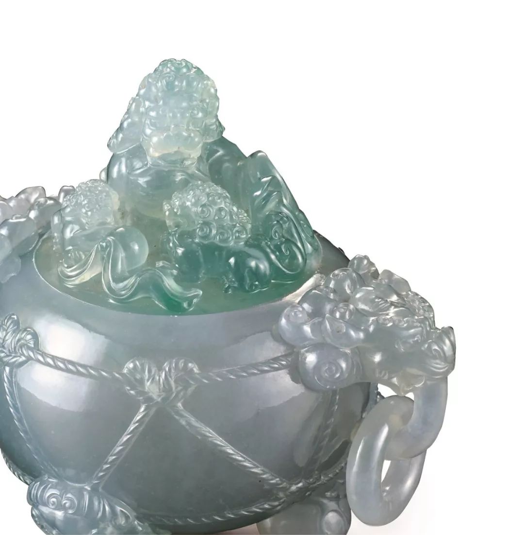 此香爐擇上等冰種翡翠雕琢而成,質地清亮似水,冰清玉瑩,極為罕見。爐分為爐蓋和爐身兩部分。蓋雕三獅,大獅方頭闊嘴,雙眼圓睜,軀體健壯,四肢粗壯,鬃毛散披,獅尾捲曲,姿態威猛。兩小獅伏於大獅身前戲耍繡球,小獅體態小巧可人,生態刻畫生動。爐身圓口鼓腹,上面飾有繩紋,創意獨具匠心。爐身兩側雕有雙龍耳,龍口銜活環,身下有三獅面矮足承托。整器造型端莊大方,風格古樸典雅,雕工極致,紋飾繁縟,為典型的造辦處精品。