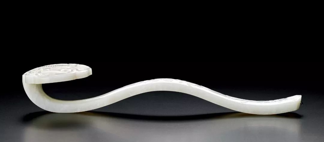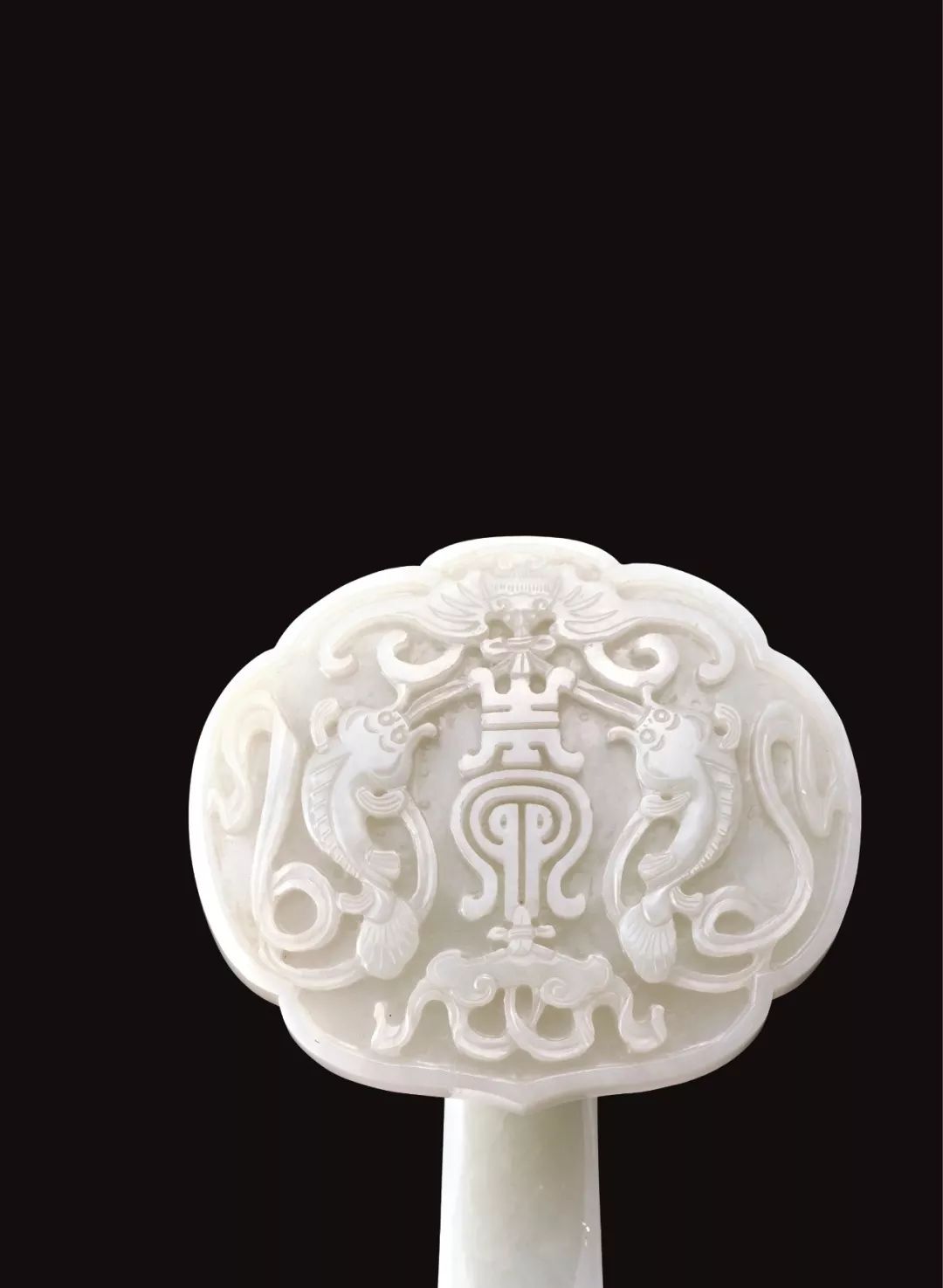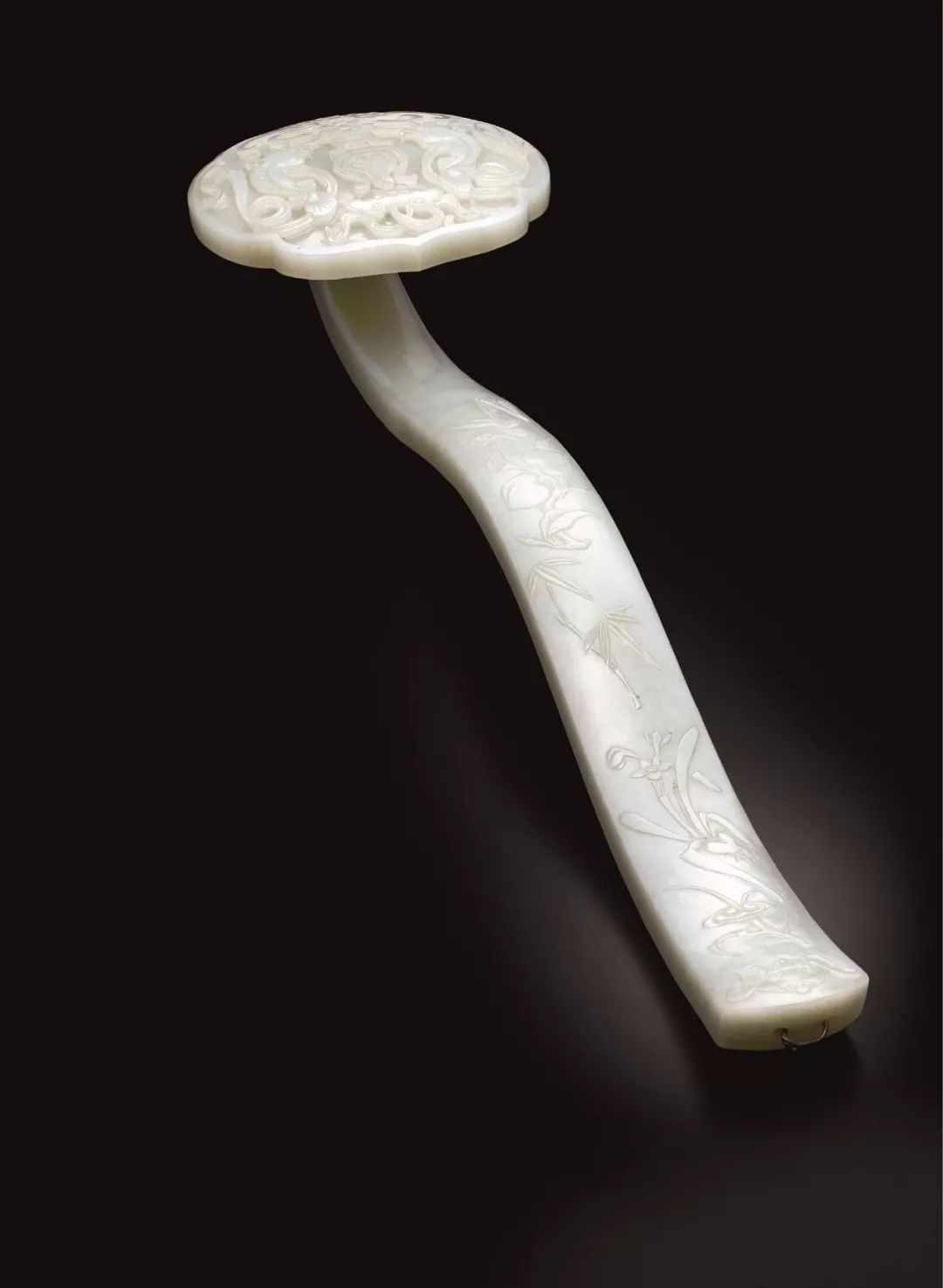 此柄如意以整塊白玉雕琢而成,質地光潤,如意呈瑞芝狀,云葉首,四周起如意紋邊框。如意首面隆起,正中心雕壽字,下面浮雕吉磬,吉磬綬帶飄曳,左右懸雙魚紋。寓意萬壽無疆,吉慶有餘,連綿不絕。如意柄長而微曲,線條優美,柄面,背部雕有壽桃,竹葉紋,花卉紋,雲紋等紋飾,壽桃飽滿,花朵枝葉繁茂。柄末端刻有一蝙蝠,寓意福壽。此柄如意的紋飾表現了清代宮廷審美,可謂圖必有意,意必吉祥的用意。吉磬配雙魚,寓意「吉慶有餘」、蝙蝠寓意「幸福」,搭配壽桃寓意「福壽雙全」,雲則意義好運「長長久久」。此如意用料講究,線條洗練順暢,雕刻精細,紋飾奢華,寓意吉祥,為典型清代中期宮廷玉雕風格,實為難得。