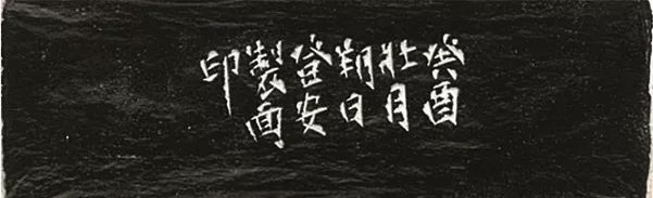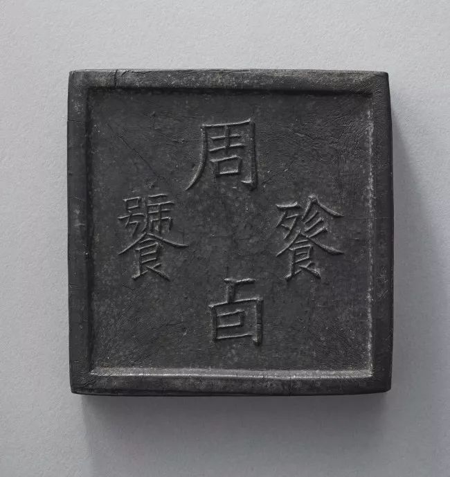 此墨四方造型,一面有“周卣饕餮”四字,一面有青銅“卣”形紋,字跡畫樣清晰,黝而有光,聞之氣味芬芳,是難得的程氏遺墨。此墨最初為日本近代著名政治家犬養毅舊藏,後被日本近代書法篆刻家松丸東魚所藏,附有原裝錦盒,盒內有收藏印“白林遯叟”(白),“七十七翁木堂”(朱)“東魚欣賞”(朱)。