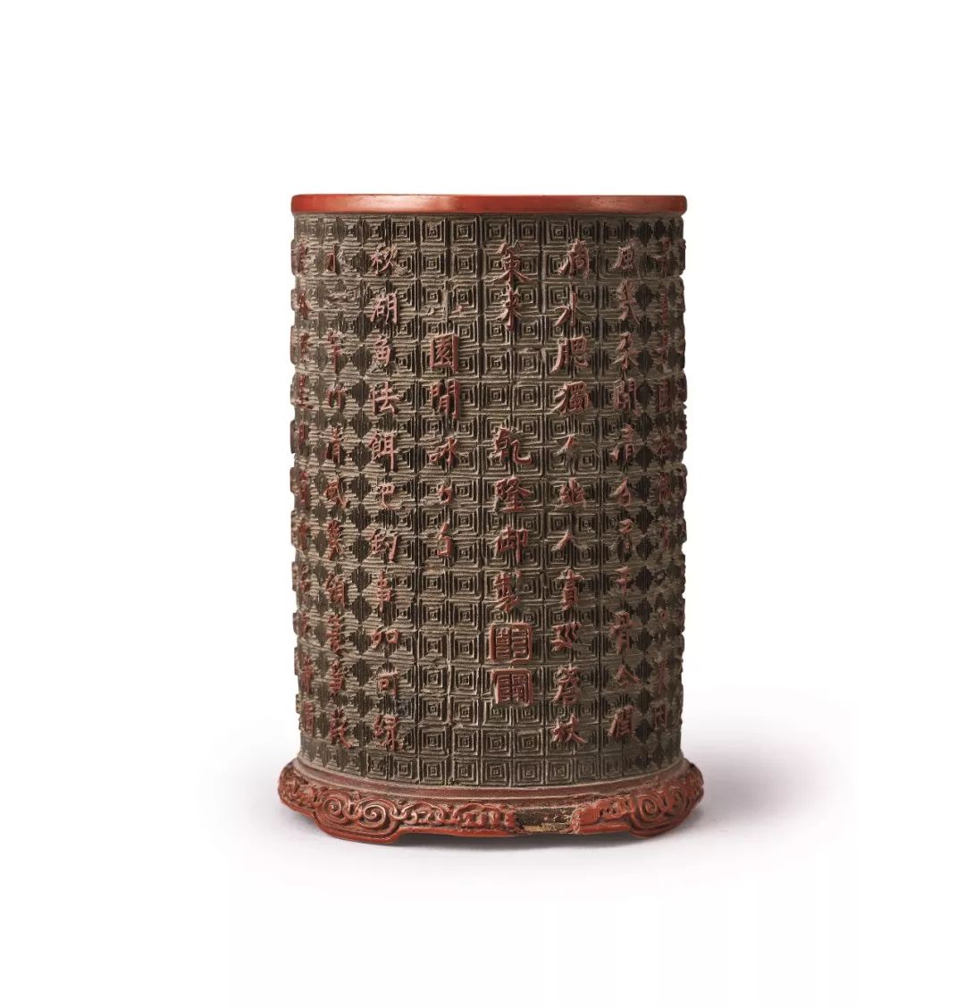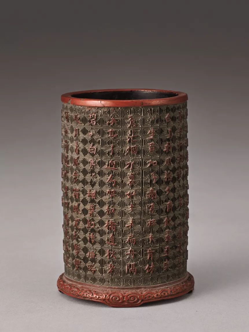 此器圓口直筒,下承卷雲紋臺足,器外整體修紅漆,筒內髹黑漆。筒外側遍布黑地回形錦地紋,上綴紅雕漆乾隆帝禦題詩文五首,行文流暢,字體工整。筆筒筒壁之禦題詩被收錄於《欽定四庫全書·禦制樂善堂全集定本卷二十七》,共有《蘭橈獨釣》、《竹籬鶴步》、《蘆岸秋晴》、《板橋霜跡》、《雪徑梅姿》這五首詩文,冠以《小園閑詠五首》之台頭,吟詠風花雪月之絕景,充滿著閑雅自在的文人意趣,文末署有「乾隆禦制」和「乾」、「隆」二方印章款,彰顯出尊貴的皇室風範。