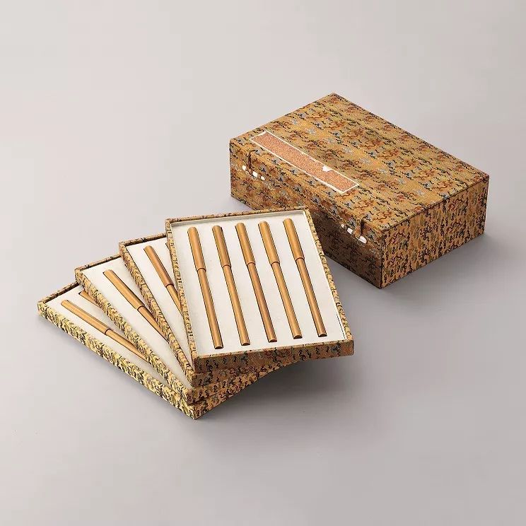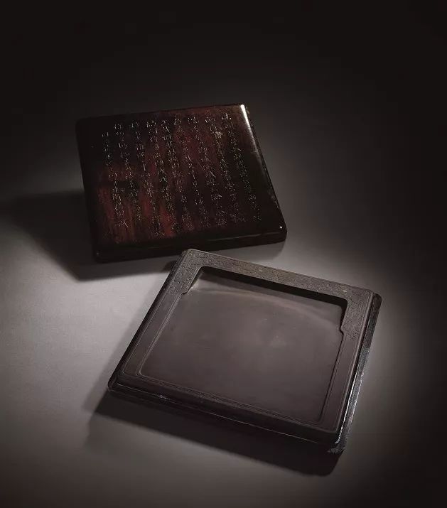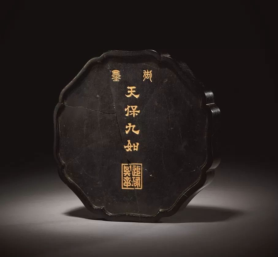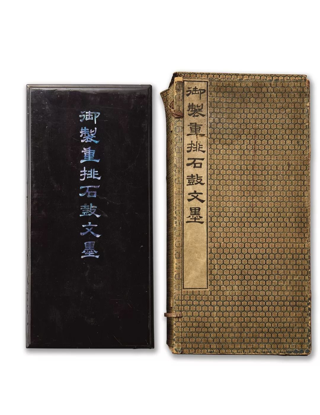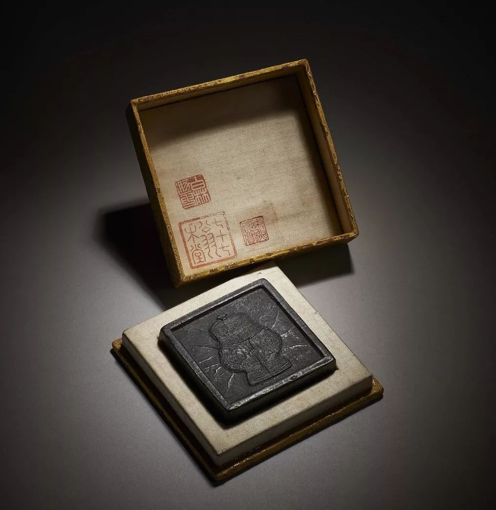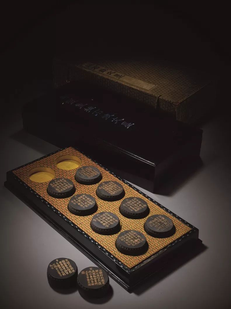 禦製仿石鼓形墨,一套十錠,通體烏黑。鼓身陰文填金臨書石鼓文,鼓面填金篆天幹以做排序。全墨十錠,造型整齊劃一,所填金粉其色金而不艷,與墨之黑色相互映襯,獨顯皇家氣韻。外配黑漆嵌螺鈿四方盒,盒蓋嵌螺鈿書墨名“禦製重排石鼓文墨”,其外再有錦盒包裝,上有隸屬書“禦製重排石鼓文墨”,個盒之用錦及內部裝飾用錦與北京故宮博物院藏“禦製石鼓文集錦墨”完全相同,茲可比較。