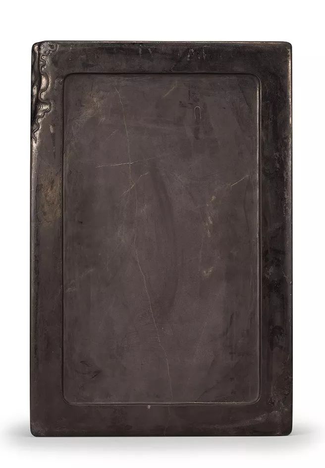 此硯老坑端石雕琢而成,器呈四方隨形,做門字淌池形,硯邊雕迴紋,夔龍紋圍就,硯額中心處雕蝙蝠紋,硯背淺雕覆手,左側棱角處隨形雕流雲文。硯堂寬碩平整,硯堂石質純淨,石品豐富,蔚為壯觀,集天青,浮雲凍,碎米凍,冬瓜瓤青花,玫瑰紫青花,冰紋,金線,五彩疔等諸多名貴石品與一體,且各個特點鮮明,毫無挑剔,當為各石品之代表。此硯整體雕刻極為規矩,線條婉轉得當,柔中帶剛,使得紋更顯飾典雅高貴,加之此硯碩大,堪為老坑之極品,極為難得,可寶可藏。