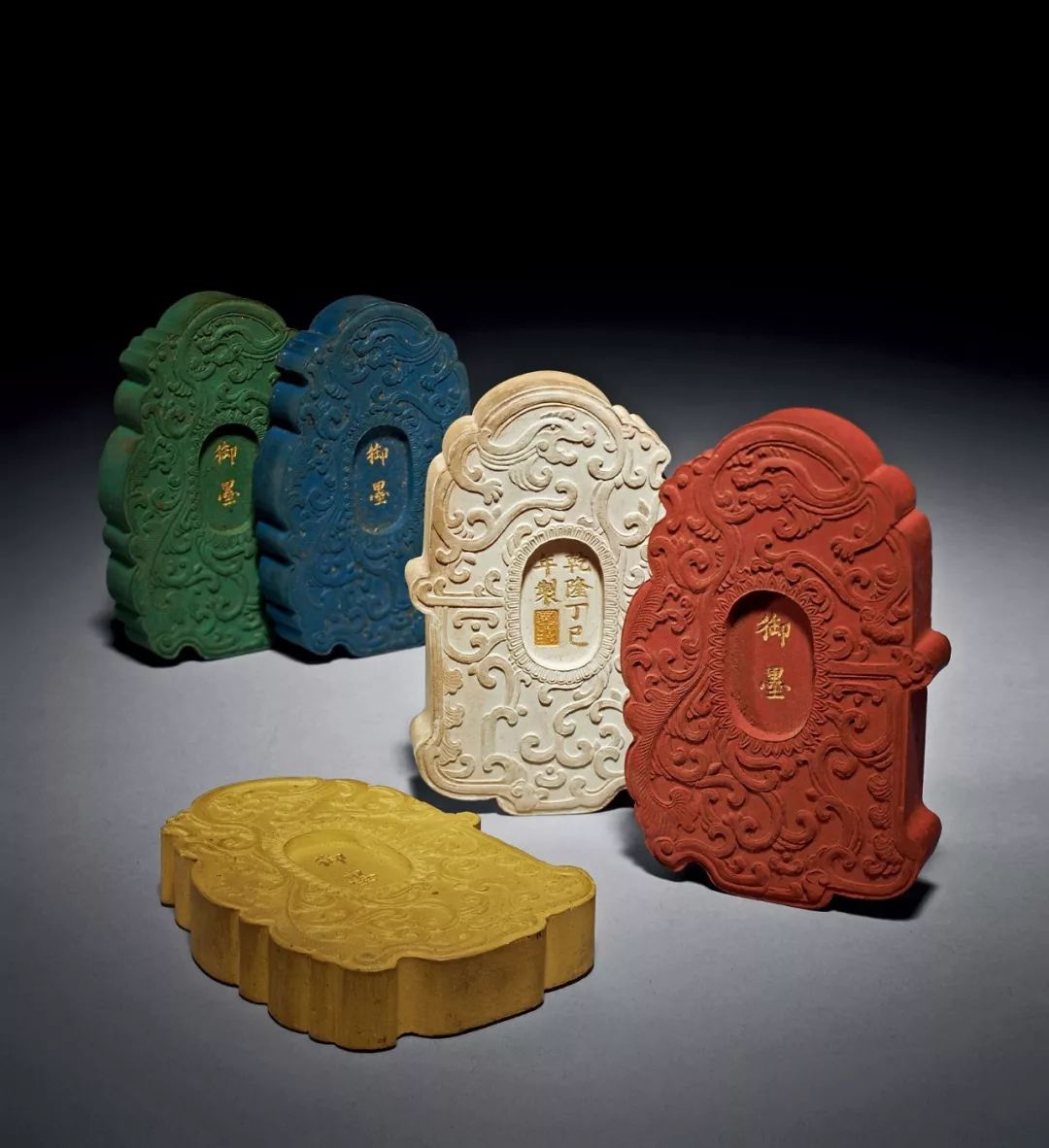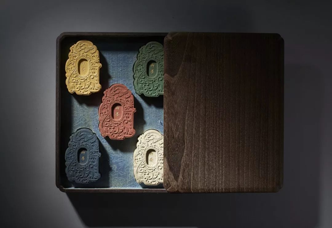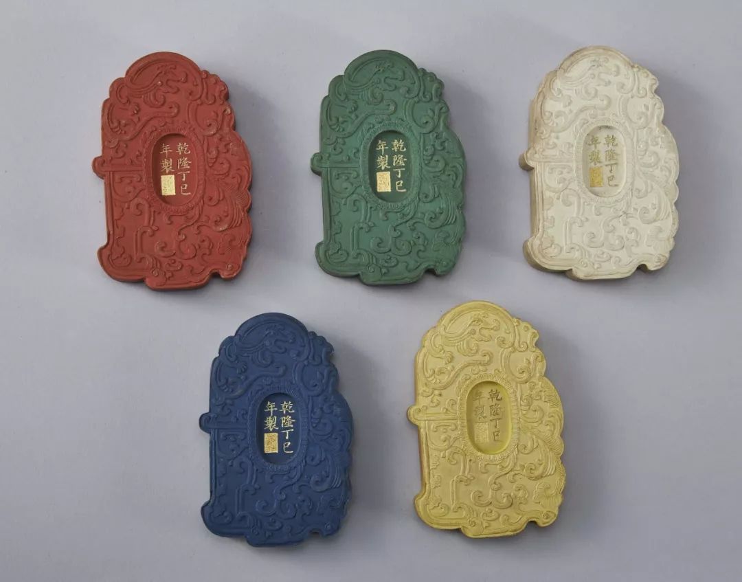 此套御墨,一盒五錠,色分五色,為正紅、正青、正綠、正黃、正白。正反兩面均模印夔龍,夔鳳紋,中間填金刻楷書“乾隆丁巳年製”。墨形均規整大氣,線條靈動,統一劃一。五墨之五色,均用天然朱砂、石青、石綠、藤黃、蚌殼等礦植物原料配以廣膠精制而成。