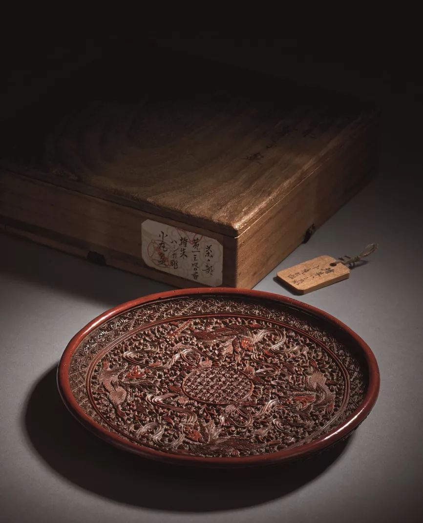 此器木胎剔紅漆而成,唇口,淺腹,口沿雕錦地紋一周,下接雙圈,盤心雕錦地紋做繡球狀,球與雙圈之間,雕瑞獅四只,均口啣錦帶,嬉戲舞動,姿態萬千。盤背雕纏枝蓮紋一周,圈足,足內修黑漆。全器構思奇巧,雕刻繁複,尤其各只獅子之形態,或回首,或昂揚,均各有風格,毫無雷同重複之感。群獅戲球爲漆器傳統之紋飾,常以大獅,小獅呈現,意爲太師,少獅,寓意官祿世代相傳之意,本件雕工精湛,主體突出,品相完好,堪爲明代剔紅之精品。