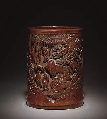 全器雕刻極惟妙細膩,八個人物主次分明,每個人物的性格特點,同中有異,異中有同,多樣而又統一,構成一個整體,彼此襯托映照,有如一座群體畫面,藝術上確有獨創性。筆筒采用圓雕、淺浮雕等工藝技法,把八仙的神態刻畫的惟妙惟肖。筆筒顔色深沈,包漿厚重,是一件難得的竹雕文房用具。