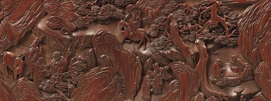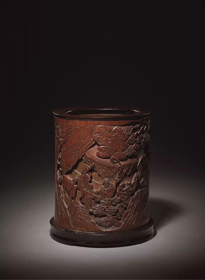 此筆筒直筒形,腹部微斂,嵌紅木口及底,底設三矮足。筆筒外壁以圓雕、深浮雕結合,通景雕刻,山石深峻,松林蒼郁,煙雲層巒掩映,更添幾許飄渺氣息。八仙三兩成組,五官刻畫細致,各有情態。其中張果老銀須飄拂,倒騎驢緩步林間。松陰下,呂洞賓與鍾離權駐足下棋。何仙姑、藍采和和鐵拐李依次而行,仙鶴在側,鐵拐李手中葫蘆仙氣袅袅。山石有劈皴,位置經營,以巨岩過渡畫面。