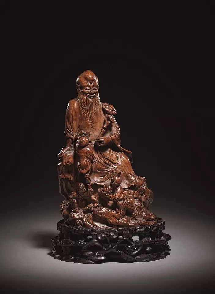 此件竹根圓雕而成,做群嬰祝壽立件,全件黃褐顯紅,包漿自然,古氣十足。器身雕壽星翁坐於隨崖石之上,頭頂隆突,眉如彎月,方口厚唇,長須飄飄,面帶笑容,衣褶流暢。壽翁一手持靈芝,一手脫附于石上,周身圍繞數名孩童,或手持壽桃,或手持蝙蝠,或喜笑顔開,或相互嬉戲,熱鬧非凡。身後雕刻梅花鹿一直,回頭凝視,憨態可掬。器下配紫檀鏤空雕如意靈芝紋座,靈芝相互纏繞,極為精美。