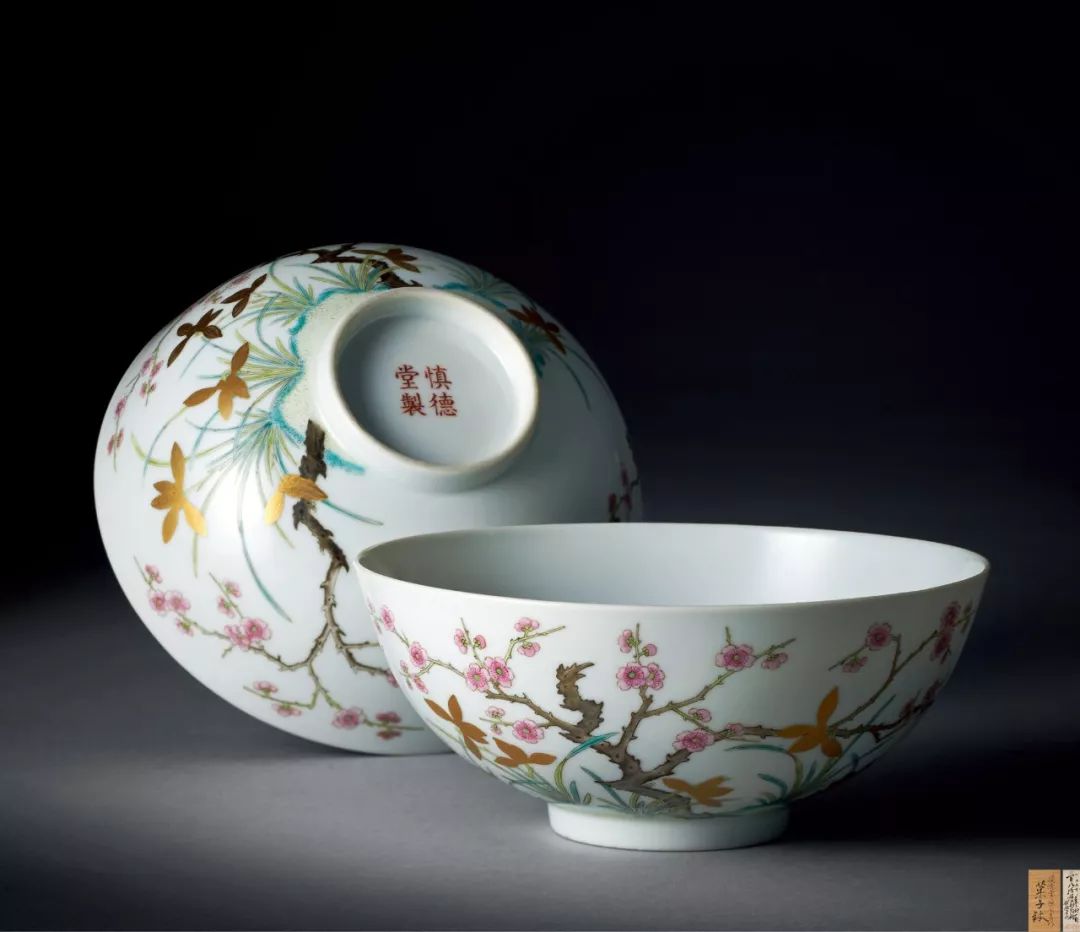 Lot 27    清道光 慎德堂款粉彩描金梅蘭紋碗一對