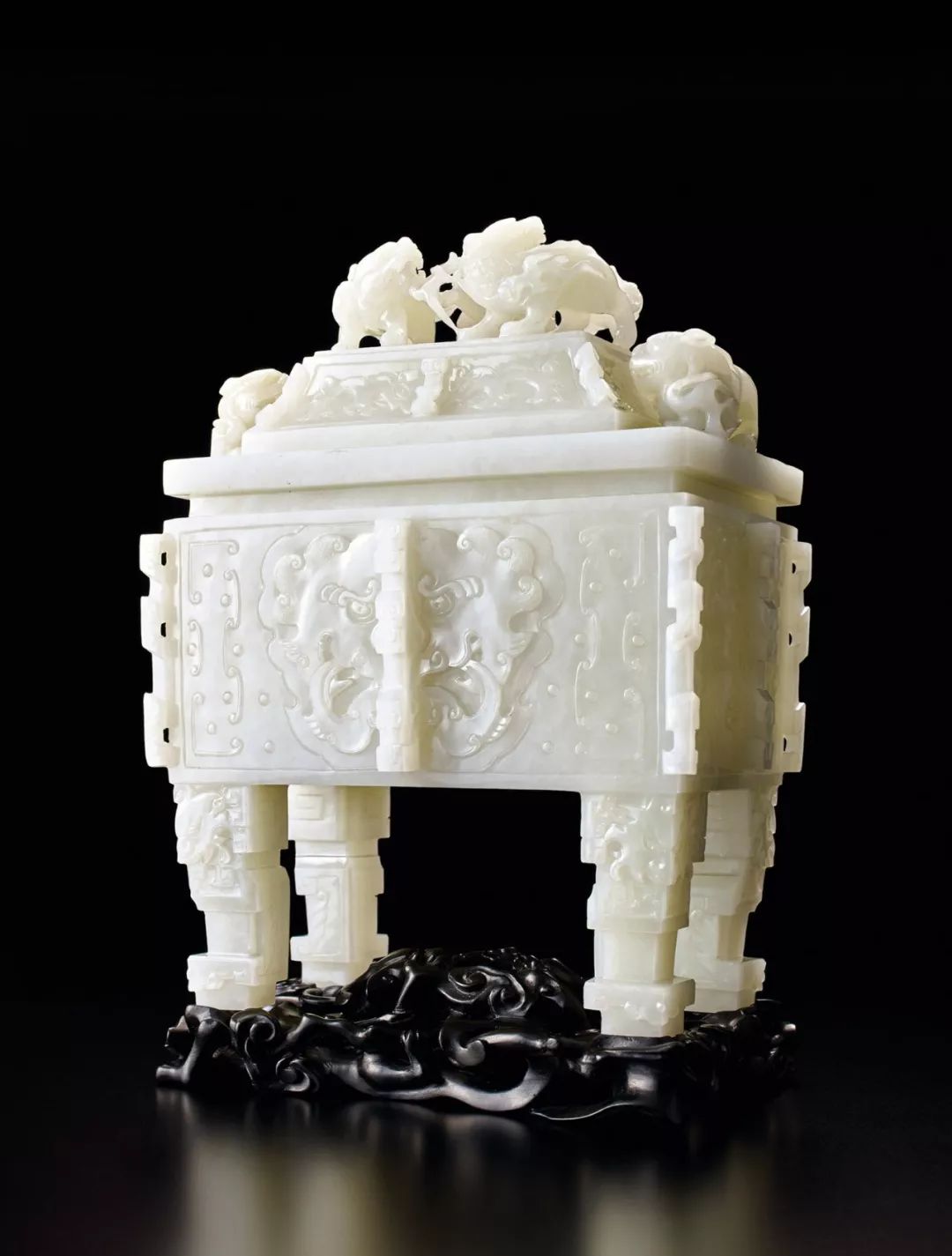 Lot 30    清乾隆 白玉雕太獅少獅鈕饕餮紋鼎式爐