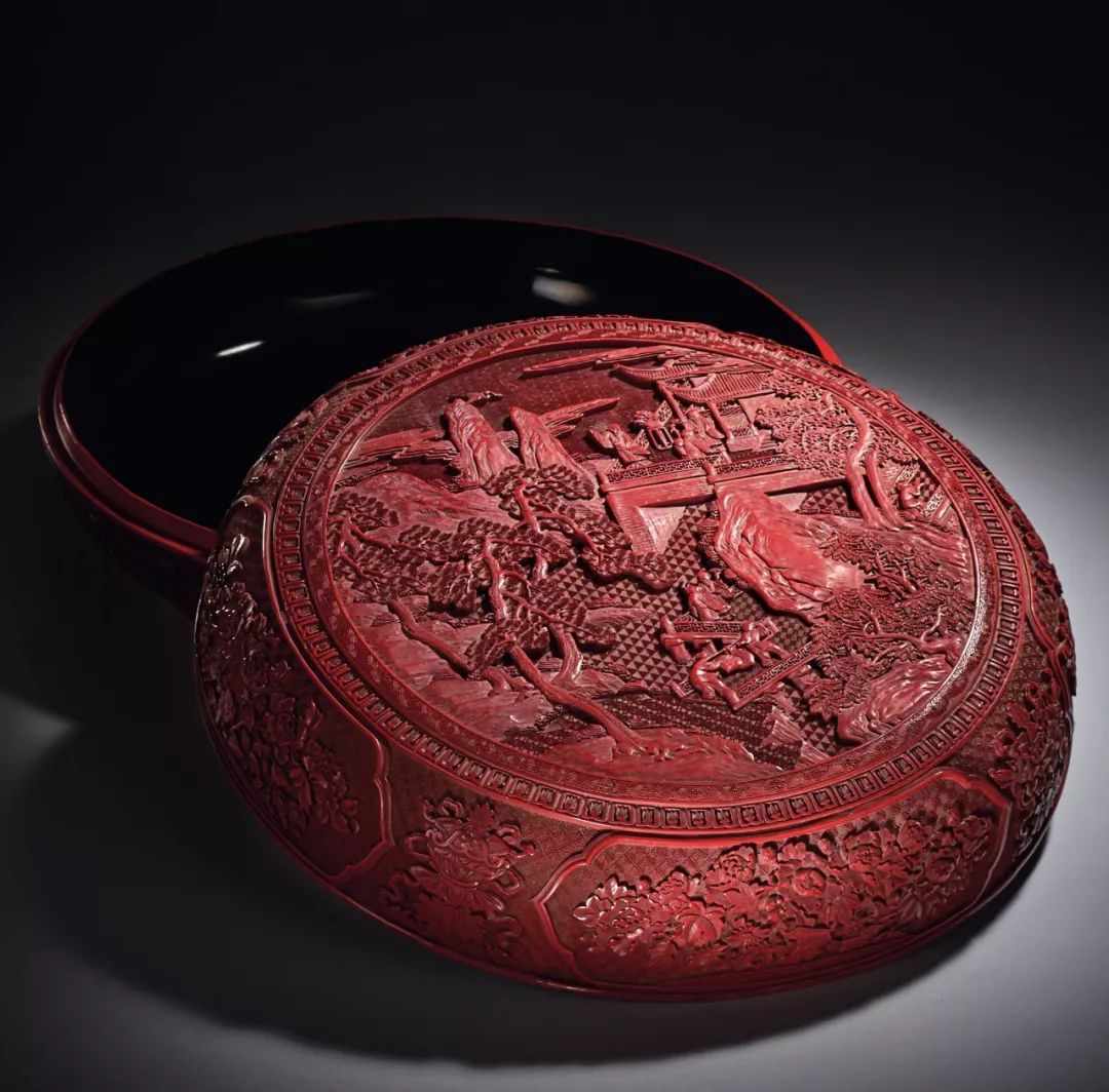 Lot 37    清乾隆 剔紅獻壽圖四壁開光花卉紋捧盒