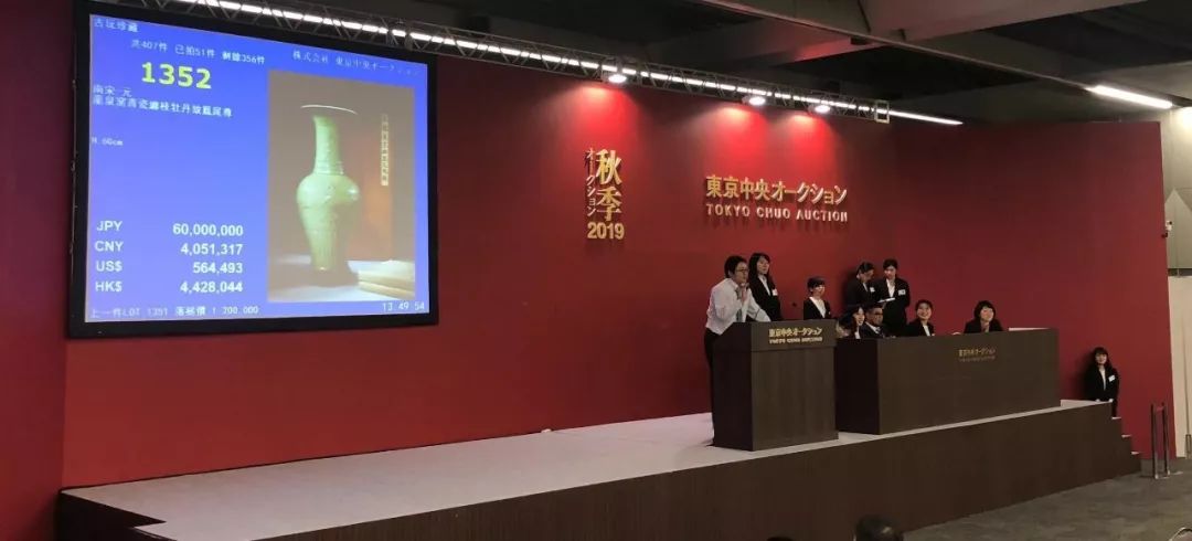 東京中央2019秋拍今日在東京圓頂飯店璞利斯姆大廳舉行了《一期一會 聽茶聞香》及《古玩珍藏》兩場拍賣。Lot 1352的南宋-元 龍泉窯青瓷纏枝牡丹紋鳳尾尊在預展時已表現出不凡人氣,眾多藏家在駐足鑒賞拍品,開拍后現場競爭激烈,經過現場及電話委託輪番叫價,最終以6000萬円落槌價拔得頭籌。