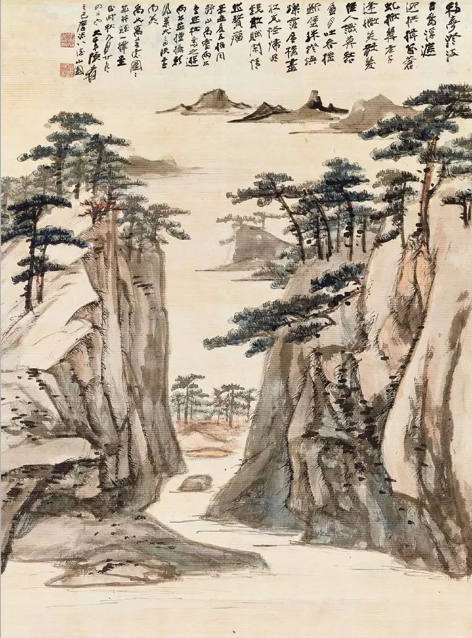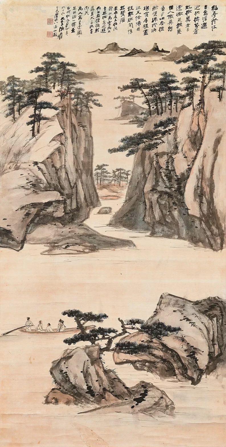 畫中戴東坡帽攜眷者,自是大千居士,作文士裝扮之同游者,即莊、郎兩人。畫家筆下粗放豪邁,設色沉厚,構圖注重取景特徵所在,奇松遍植自是焦點,而島上岩石嶙峋突兀,與間生其中的虯枝密草生呼應之效。