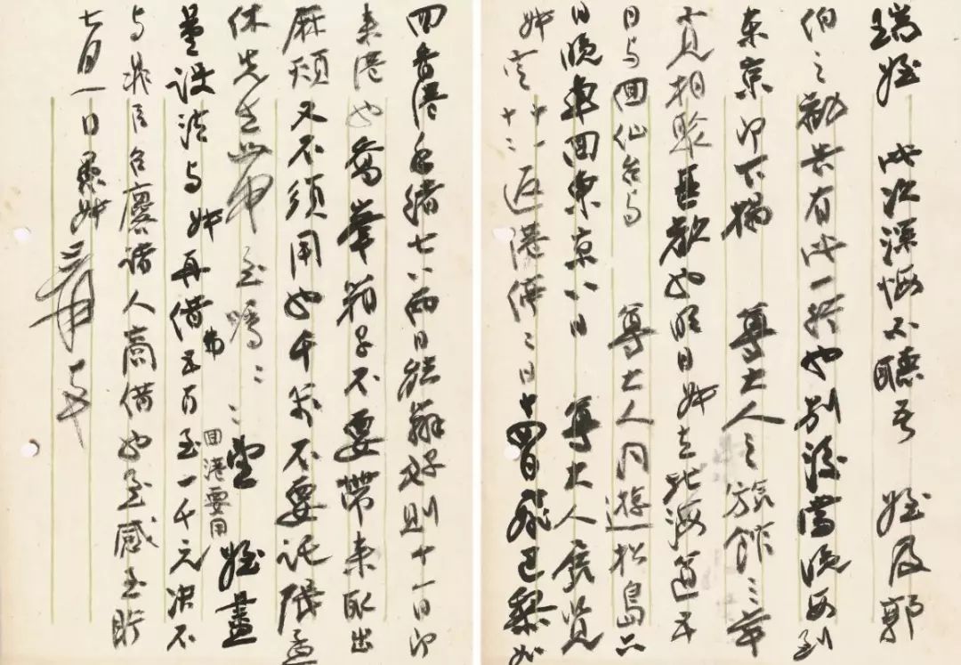 釋 文:瑞姪:此次深悔不聽吾姪及郭伯之勸告,有此一行也,別後當晚。每到東京即下榻尊大人之旅館,三年不見相聚甚歡也。明日叔去北海道五日與回仙台,與尊大人同遊松島六日,晚車回東京。八日,尊大人展覽,叔定十一、十二返港,停二日,十四日飛巴黎,如回香港手續七八,兩日能辦好,則十一日即來港也。喬峰箱子不要帶來,取出麻煩又不須用也,千萬不要託張孟休先生帶,至囑。望姪盡快設法與叔再借五百至一千元(回港要用)決不與鼎臣、召麐諸人商借也。至感至盼,七月一日,愚叔,爰,頓首。
