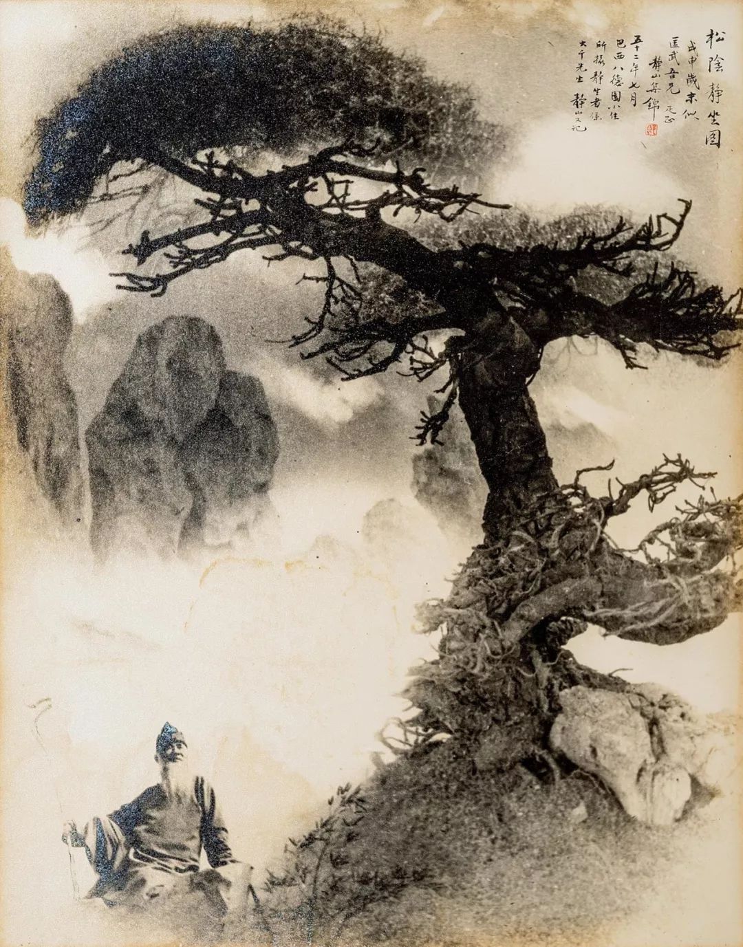 本幅為郎靜山攝大千先生靜坐之態,張大千經常出現在郎靜山的攝影作品裏面,在這幅名為《松蔭靜坐》的攝影作品中,便可以找到張大千那仿佛超然世外的身影。此照乃山水集錦巨構,是郎靜山運用國畫山水的構圖方式,巧妙地運用在集錦作品上,從畫面右邊的松樹高聳雲天到松下老翁遠眺層巒雲霧,再到遠景的山石雲霧,這幅美麗的國畫山水景像,就如同大師一生的經歷胸襟開朗,寧靜與世無爭。