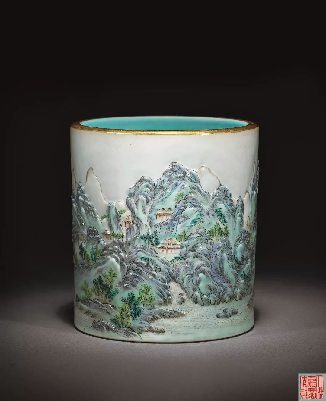 清嘉慶 粉彩浮雕通景山水圖紋筆筒