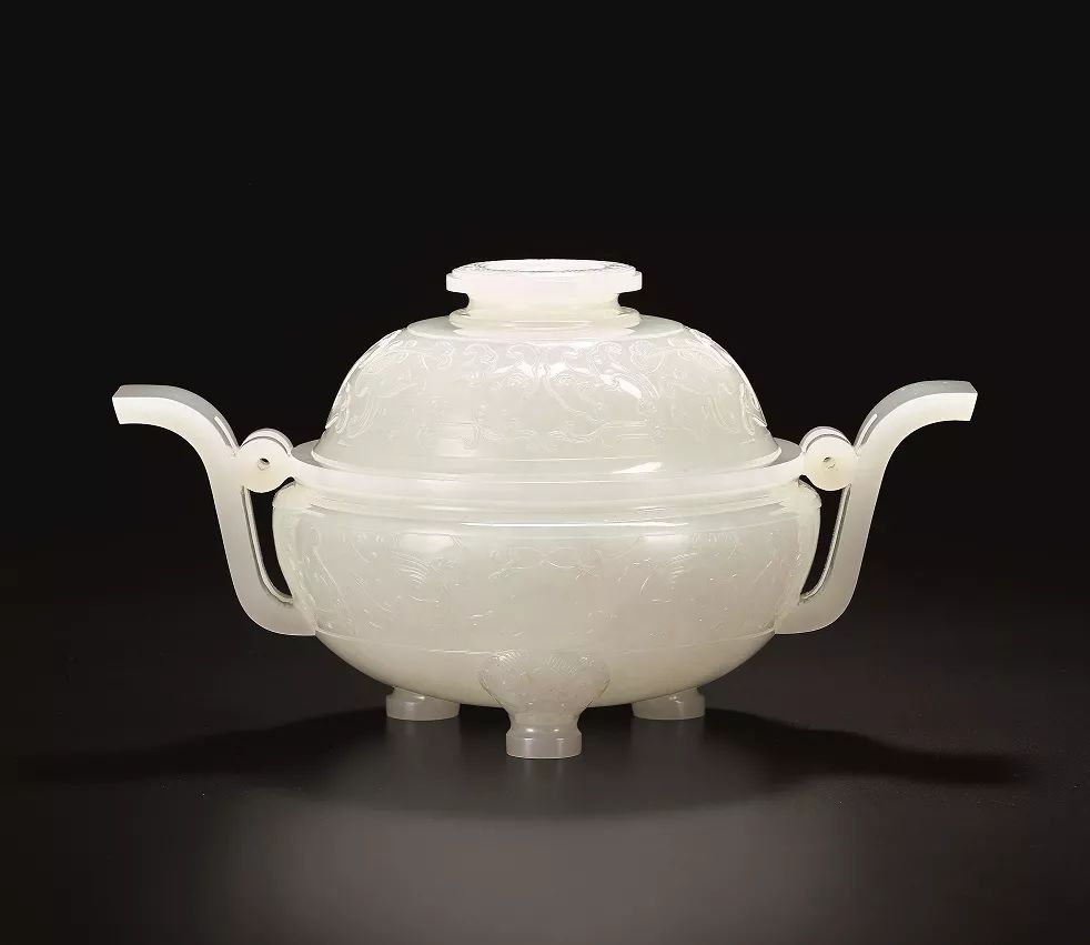 清乾隆 白玉雕圓頂式雙朝冠耳獸面紋三足爐