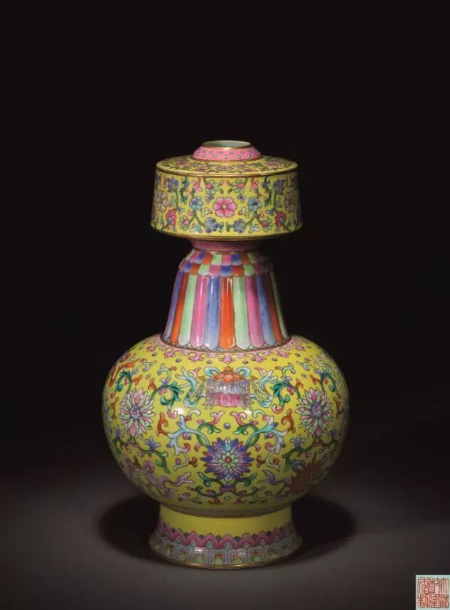 清乾隆 黃地粉彩纏枝番蓮八吉祥紋賁巴壺