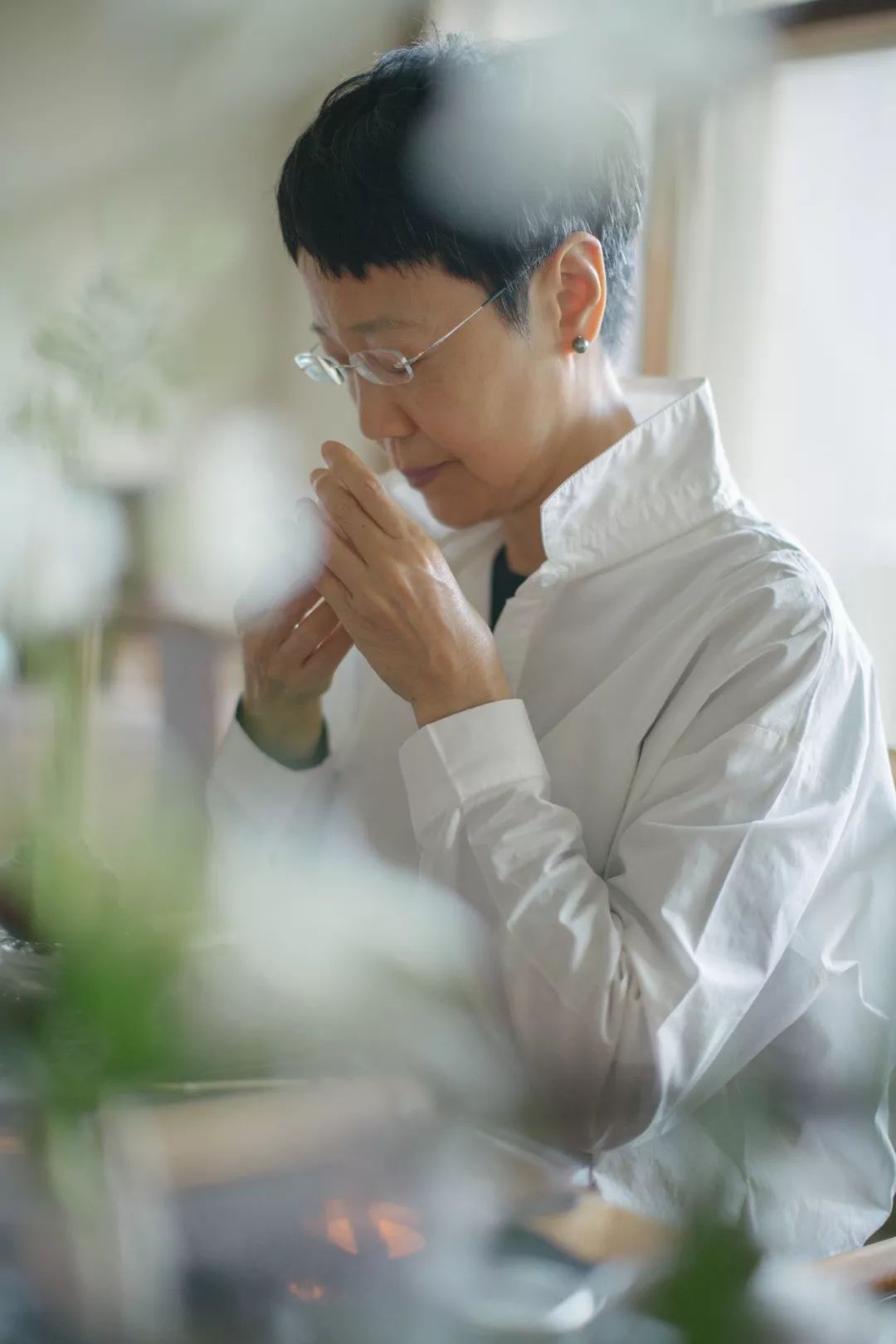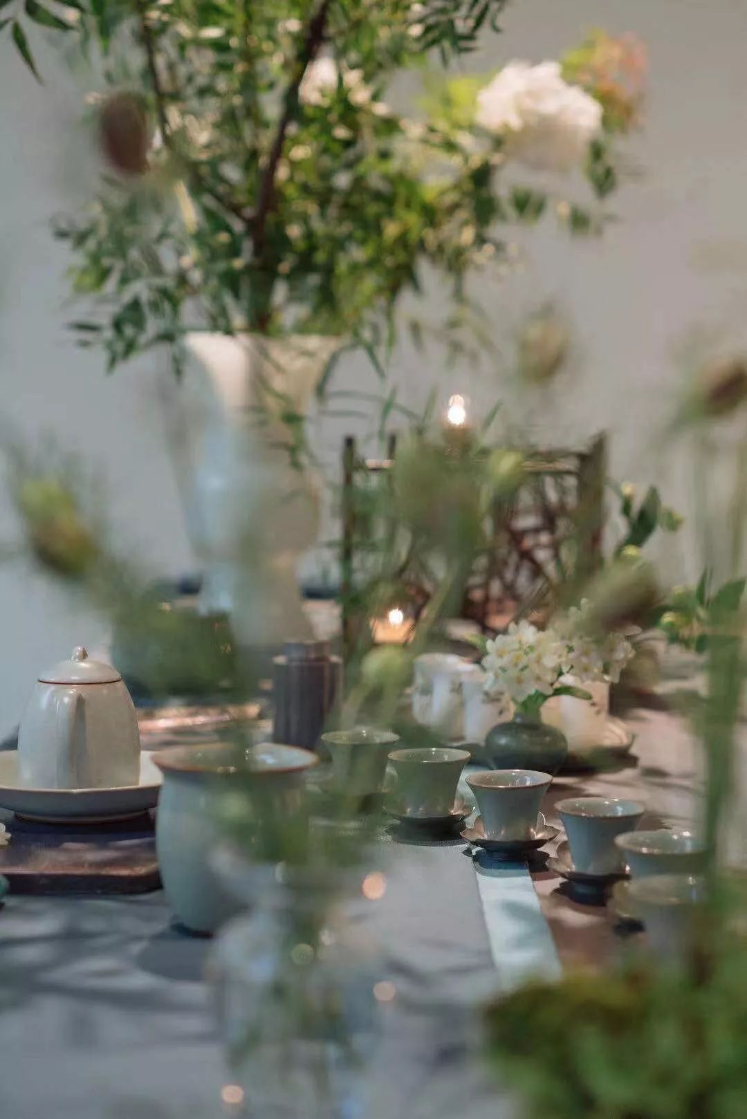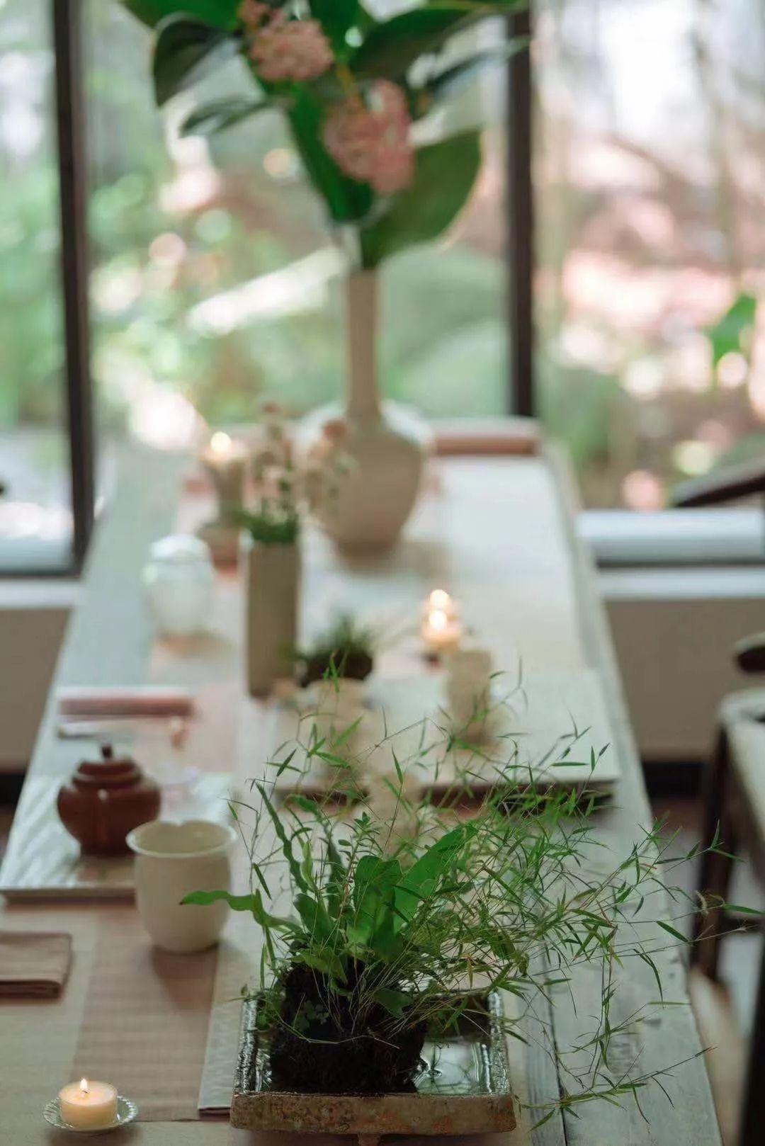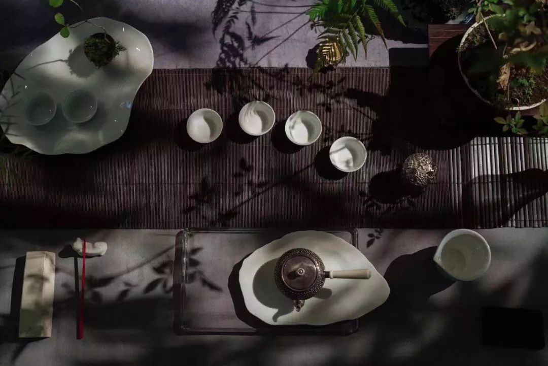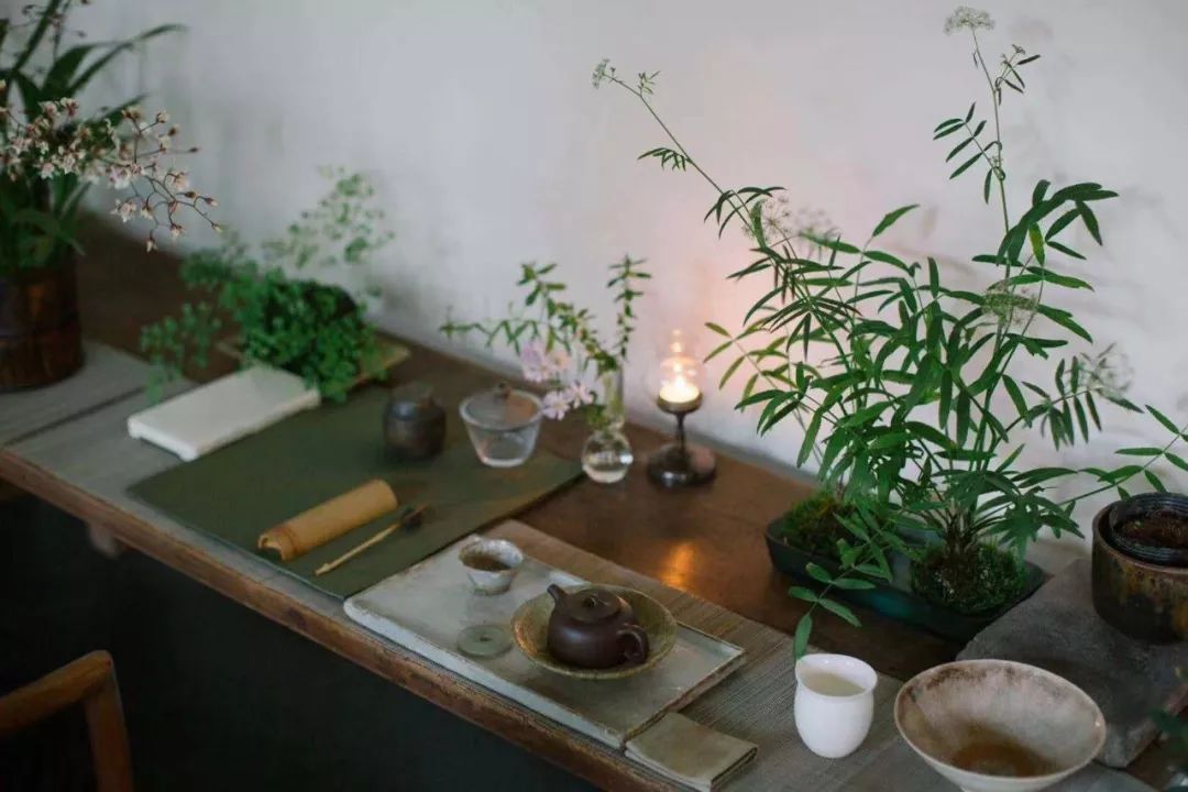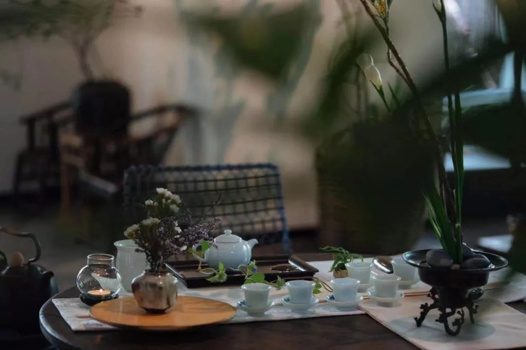 看著解老師把一些雅緻的小花草融入茶席裡,我開始理解她所說的傳統美學與思想復活在我們的當代生活中。「我們都可以看到在古代文人畫中,文人都會尋找一處悠閒的地方,除享受山水美景外,還可以品茶吟詩。由於我學習的是繪畫,本來就喜歡園林,所以我很自然地就把花草放到桌上來,營造「案上山水」, 這也是我的生活態度,一種城市山林的感覺。希望在這間小小的屋內,流動著生機勃勃的氣息,和自然、寧靜、詳和的光暈。這是一個往內走的場域,希望來的朋友進到這個空間時也都能感受到一份自在、悠閒的感覺。」