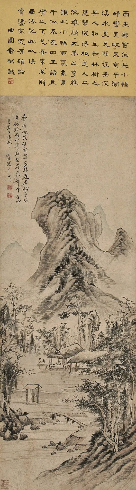 詩堂:雨生都督作此小幅,峰巒突兀,夾寫平湖溪水,更見蹊徑幽深,其人物生動,竹樹之蔥鬱,深得梅道人之沉雄,趙大年之秀雅。雖此小幅而氣象萬千,似不在四王諸巨擘之下也。吾素不解畫法,記此以俟賞鑒家,定有確論。曲園俞樾識。