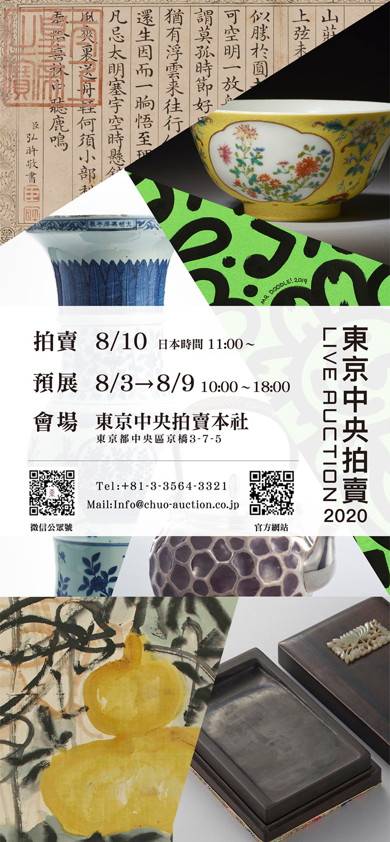繼上回拍賣,東京中央拍賣將於8月10日再度舉辦多場景LIVE AUCTION。屆時將推出眾多精選拍品,種類涵蓋豐富,其中包含中國書畫、日本書畫家髙橋廣峰重要收藏、日本某古美術大家珍藏、古籍善本、一期一會· 聽茶聞香、關東藏書家同一收藏、古董珍玩、ARTS IN LIFE等各類專場,值得期待。