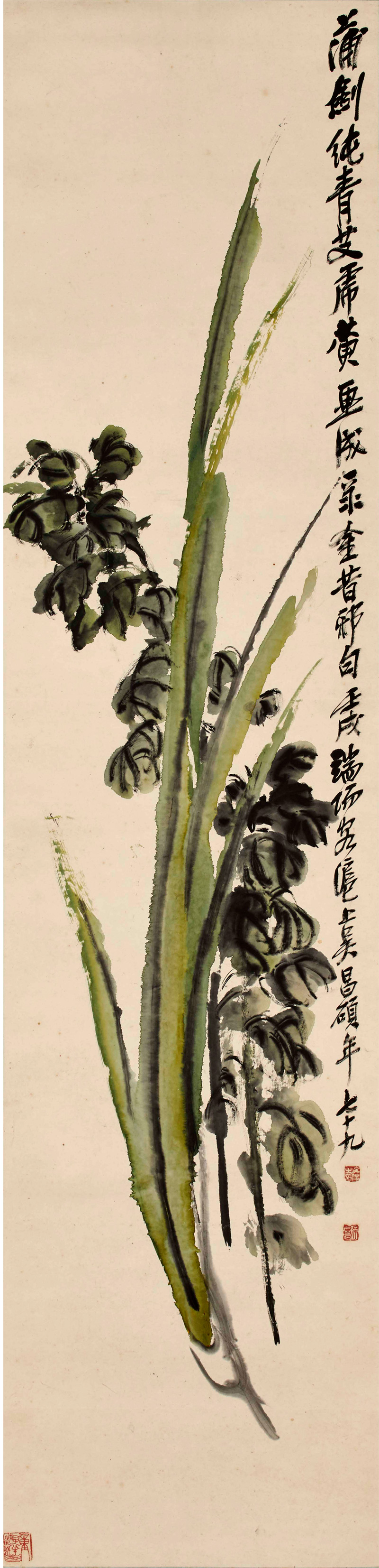 款識:蒲劍純青艾虎黃,畫成,錄金昔邪句。壬戌端陽客滬上。吳昌碩。年七十九。