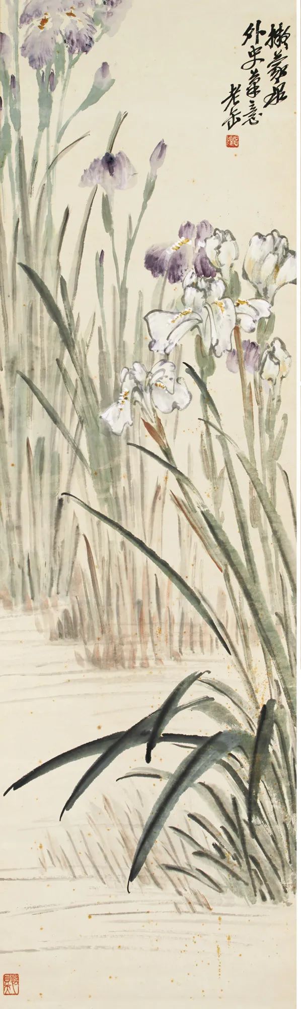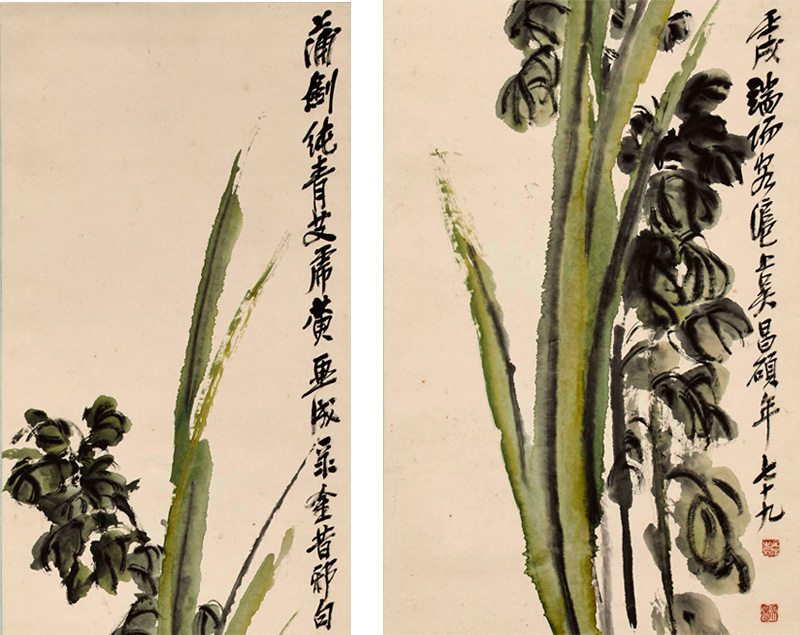 歷代畫家繪端午,往往五瑞並作,菖蒲、艾蒿之外,加上榴花、蒜頭、龍船花,稱「五瑞圖」。缶翁作端午圖,亦是以花卉、瓜果入畫最多,獨以菖蒲、艾草為主題者則鳳毛麟角。東京中央2019年春拍曾釋出一件「吳昌碩 菖蒲花圖」,為日本藏家珍藏多年精品,與本幅「蒲劍艾虎圖」題材相類,以茲對比。