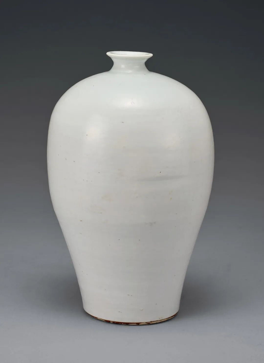 此白釉梅瓶,撇口厚唇,短頸,瓶身上豐下斂,圈足規整。器用潔白高嶺土作胎,瓷胎質堅硬致密,修胎規整,瓶身可見同旋坯痕。胎上施滿釉,釉色卵白,呈乳濁狀。厚圈足,足底露胎無釉。