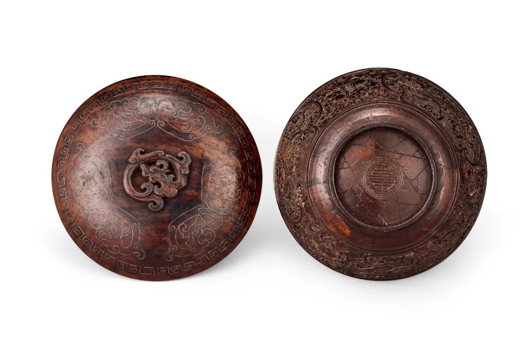 此蓋碗天然椰殼雕刻而成,敞口,深腹,矮圈足,周身滿雕紋飾,碗內滿塗紅漆,碗沿之上雕琢一周方折的回紋,網底爲冰裂紋,其上開光雕琢雲龍紋,神龍做騰躍之狀,張口漏齒,如意狀鼻,鼓目蝦須,頭生雙角,頸後生鬣,祥雲環繞身周,碗底镌刻「團壽」款。配紫檀嵌銀絲夔龍鈕蓋,紋飾精美規整,工藝卓絕。