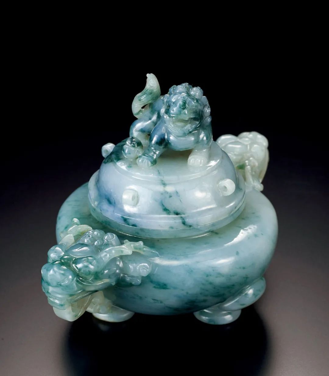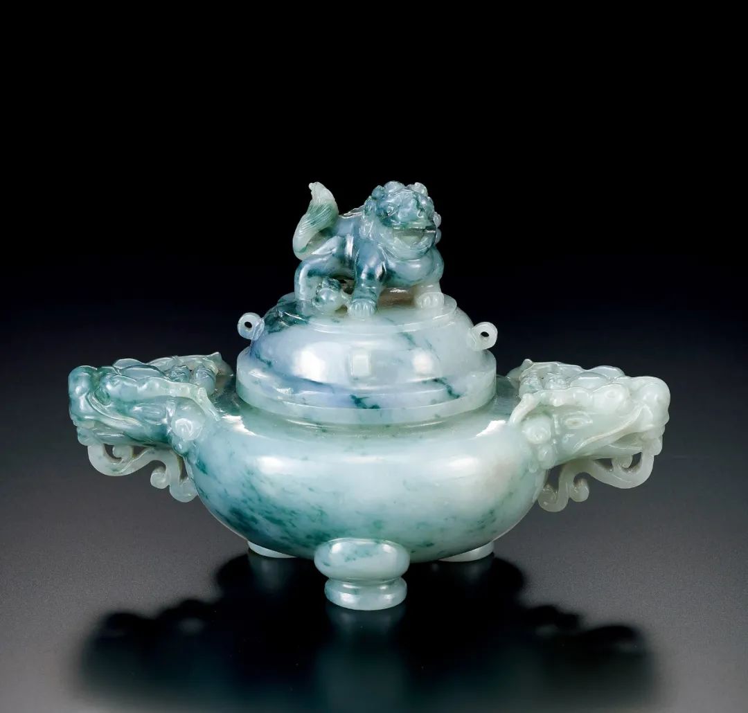清 翡翠雕獅鈕龍耳香爐