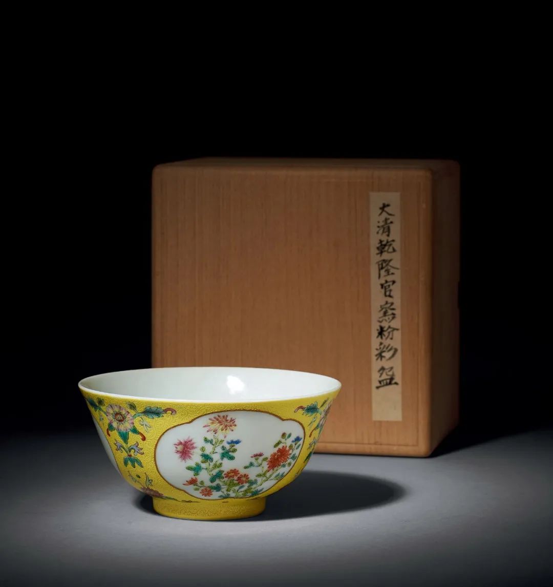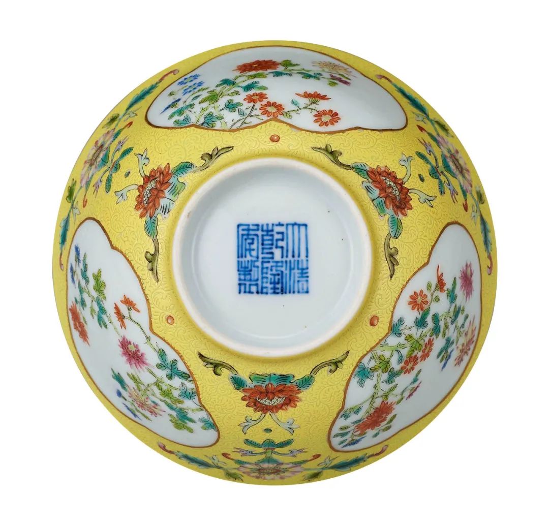 清乾隆 黃地粉彩軋道開光菊花紋碗