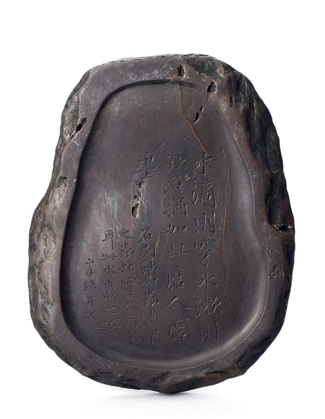 硯銘:水滴則穿 水漱則蝕 石猶如此 磨人磨墨 石剝蝕 如蟲嚙 謂之蟲蛀 實水屬之耳 此水岩之證 山舟銘並跋