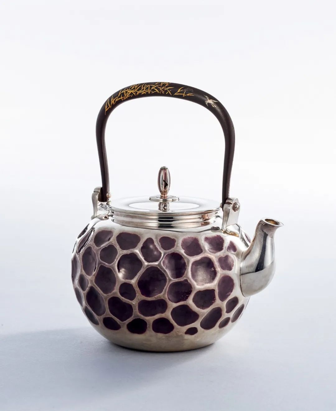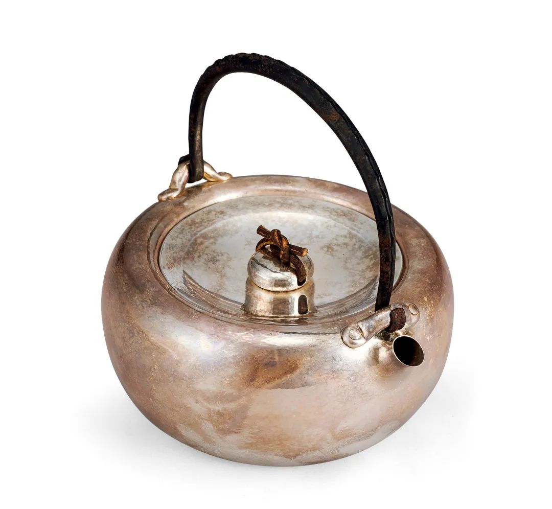 此銀壺由日本著名釜師真鍋靜良精心鑄造,壺身飽滿渾厚,外型簡約高雅,加上豆莢形鐵提梁,處處流露出真鍋靜良的精湛工藝。體積精巧,壺身呈袋形,渾圓飽滿,簡約短流與曲線優雅的提梁相得益彰。整器精美秀麗之餘,又不失風雅氣質,彰顯出真鍋靜良高超的金工技藝。壺底落「靜良造」款,為其扛鼎之作。