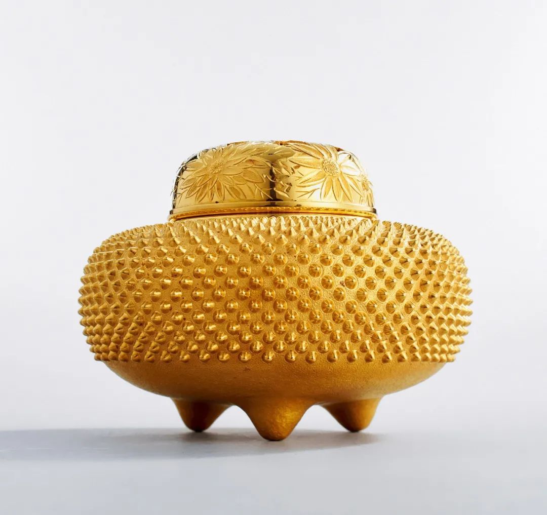 石黑光南 純金霰紋菊花蓋香爐(付共箱)