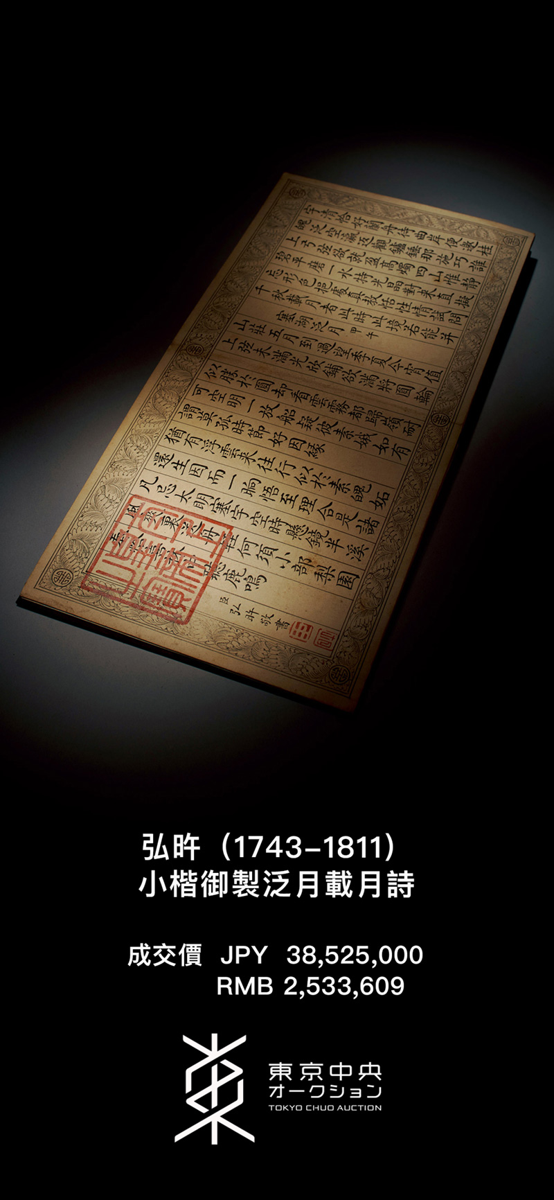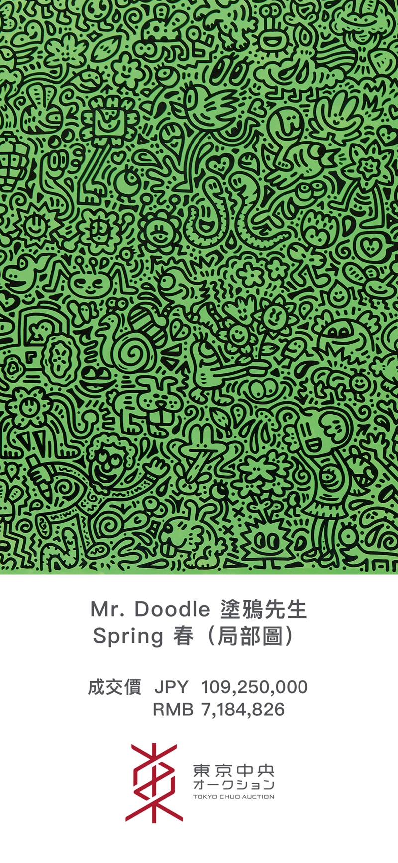 大熱當代藝術家Mr. Doodle的巨幅畫作《Spring春》(Lot 331)以800萬円起拍,一經開拍場上叫價聲此起彼伏,經過十幾分鐘的激烈喊價,最終以109,250,000円的成交價領跑全場。Lot 249 弘旿 《小楷御製泛月載月詩》經現場和網絡買家爭相競投,最終以底價逾38倍,以38,525,000円成交。