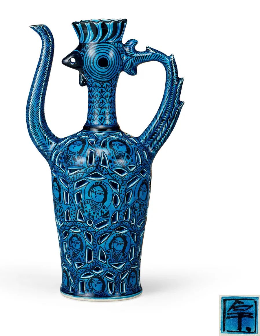 加藤卓男 青釉胡姫紋鶏冠水注(共箱)