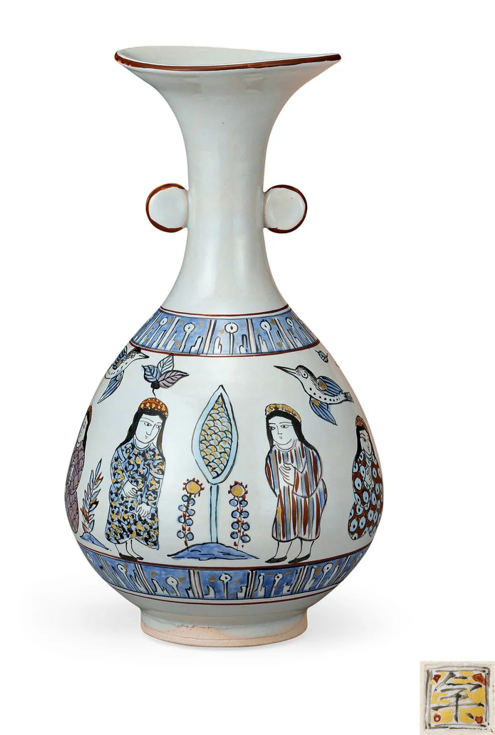 加藤卓男 ミナイ手ペルシャ色絵双耳花入(共箱)