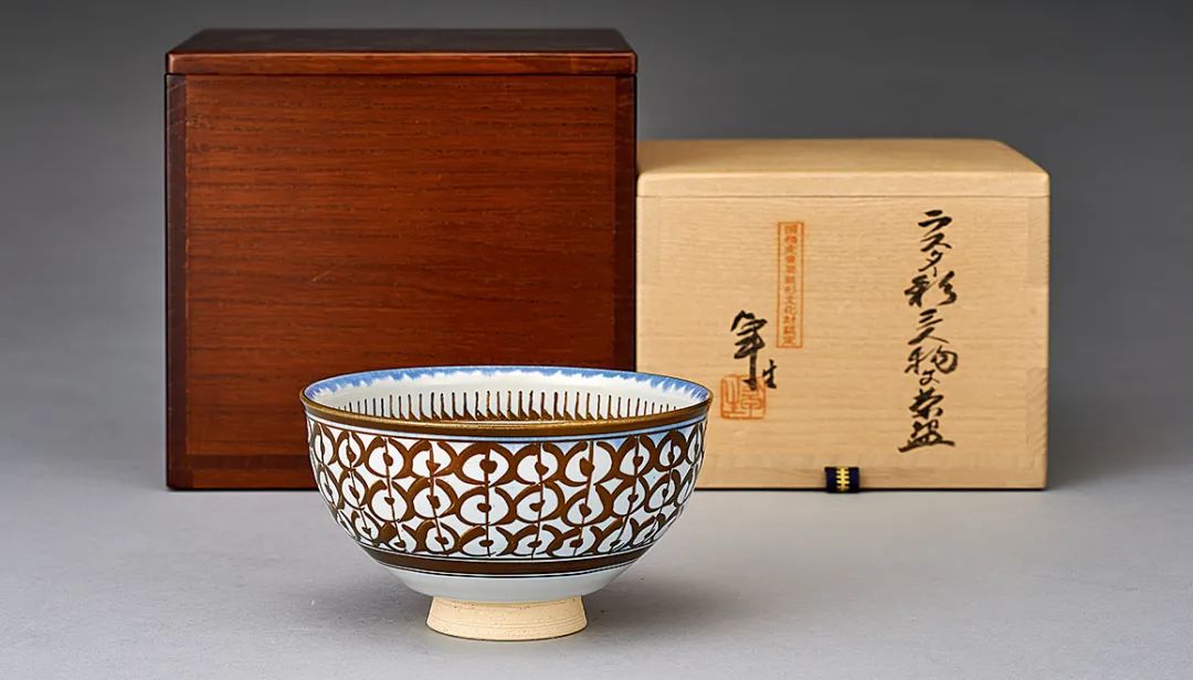 箱書(箱款):ラスター彩三人物紋茶碗 卓 国指定重要無形文化財認定