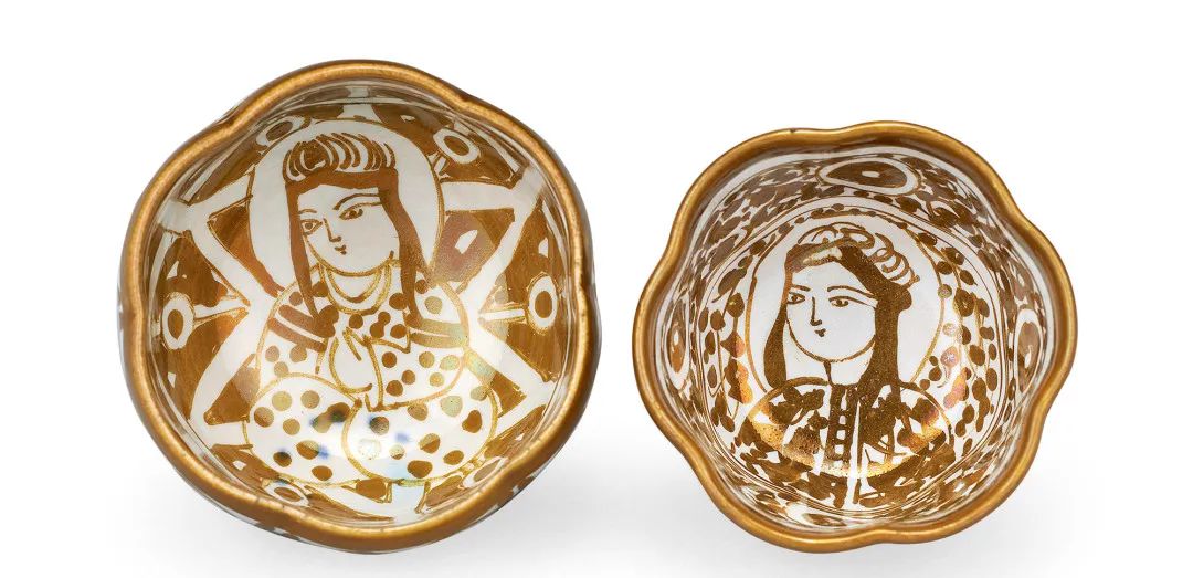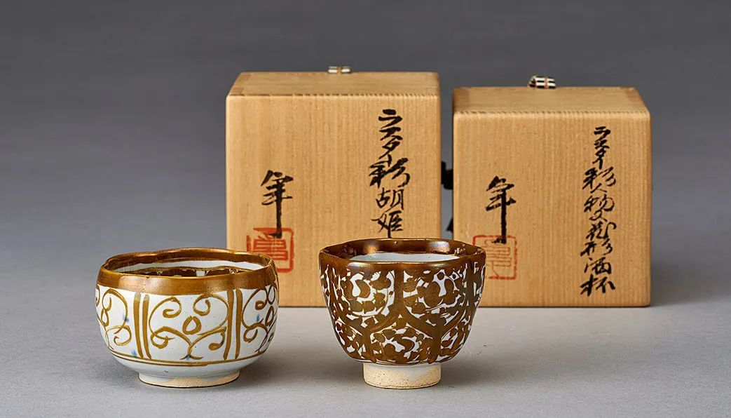 加藤卓男 ラスター彩胡姫紋人物紋花形酒杯2 点(共箱)