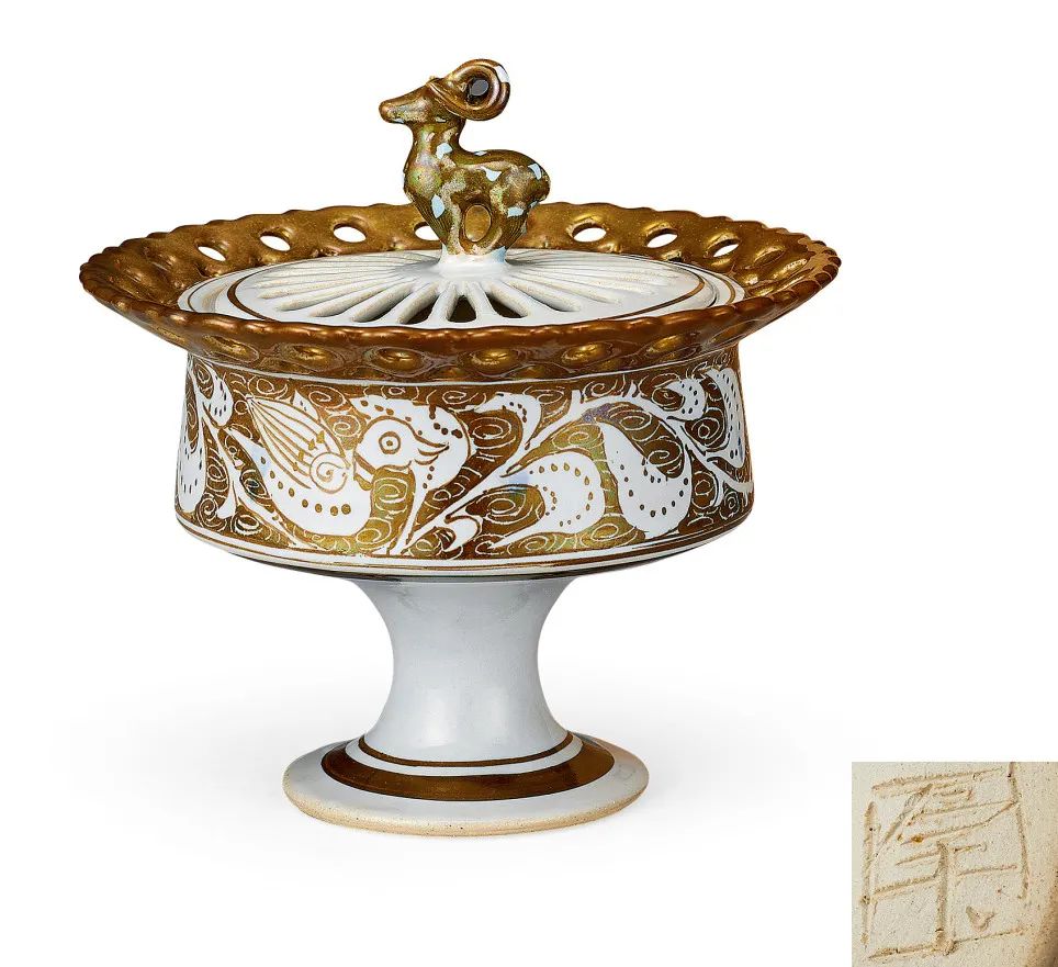 加藤卓男 ラスター彩水禽紋香爐(共箱)