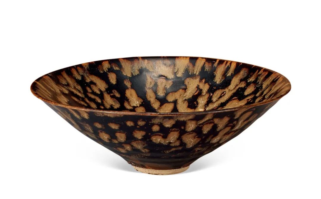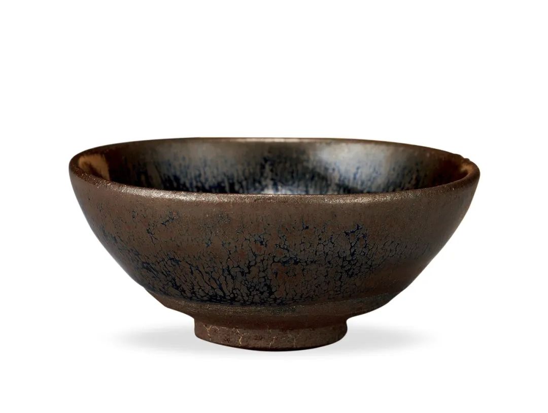 此批舊藏中,宋代器物頗多,窯口範圍涉及極爲廣泛,有定窯、建窯、吉州窯、龍泉窯、景德鎮窯等,品位高,種類齊全,是其最大特色。如Lot 53「宋定窯白釉輪花平缽」,此器花口,深腹,圈足,通體白胎白釉,釉色純正,器壁堅薄,爲少見之定窯器物,可寶可藏。又如Lot 55「宋 吉州窯玳皮天目茶碗」釉色古雅純正,品相保存完整,亦爲吉州窯不可多得之佳器。宋建窯天目茶盞譽滿東瀛,無論是個人還是各大美術館,對建盞的收藏都極為重視。三ツ松秀家收藏的這批宋瓷中,有數件建盞極為難得,其中Lot 58 與Lot 59 兩件宋 建窯兔毫天目茶碗 胎色如鐵,釉色如漆,絲絲兔毫般釉面微泛銀光,古雅神秘,堪為建窯之少見珍品。