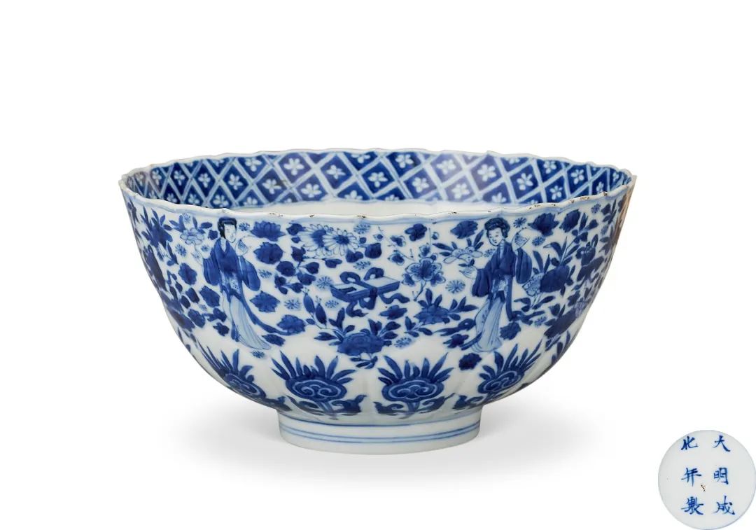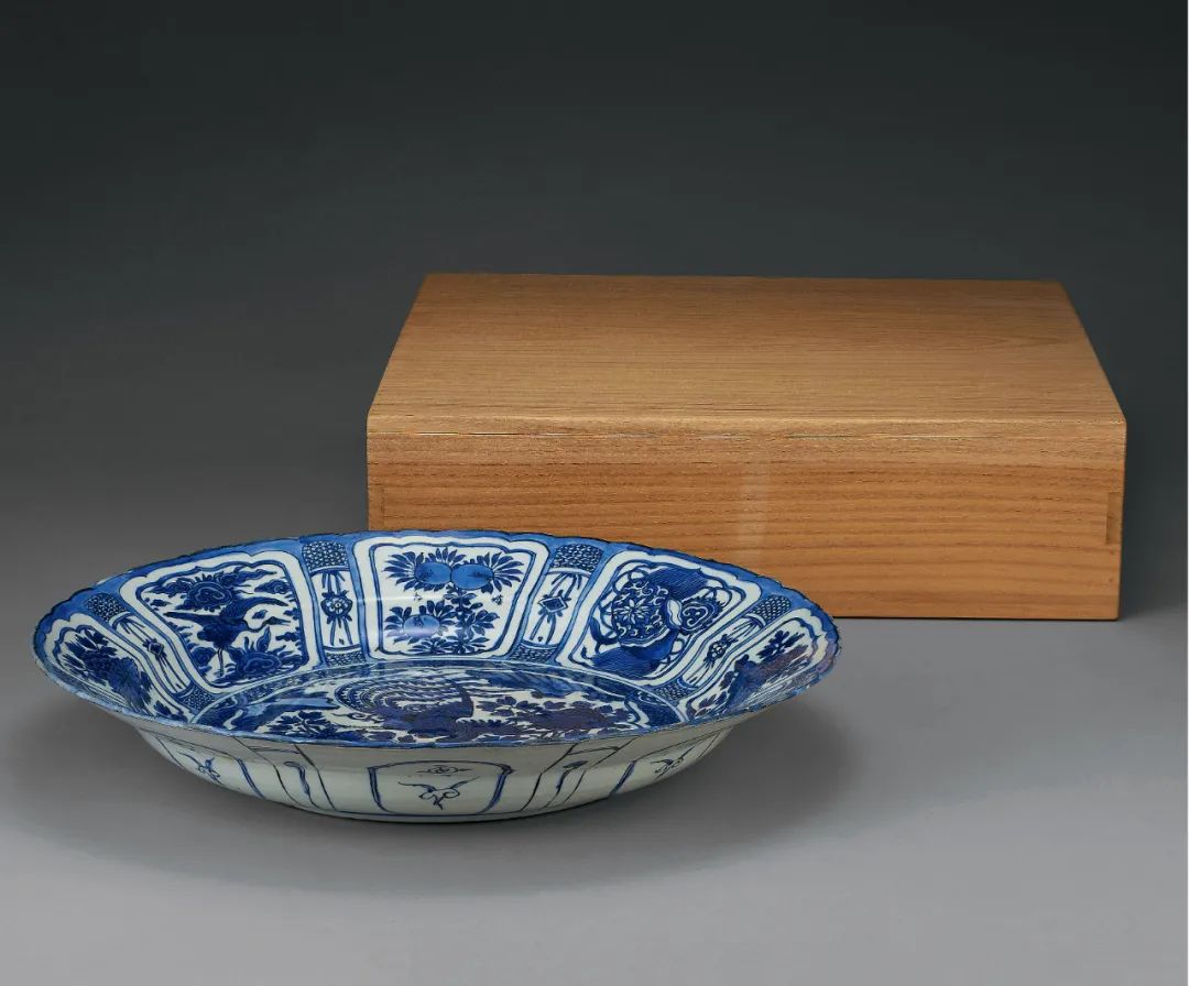 明萬曆青花燒造規模巨大,不僅供國內使用,還專門燒造貿易用瓷對外出口,其中一種既有東方民族傳統風格,又充滿著濃郁異國情趣的青花瓷盤。這種瓷盤的內壁 6到8個開光,開光內繪各種不同的錦紋和結帶、瓔珞紋飾,被歐洲人稱爲「嘉橹」,日本人稱爲「芙蓉手」的瓷器,是當時外銷瓷中的重要品種之一。此專場的Lot 79「明萬曆 染付花鳥紋大皿」,便是此種器物的典型代表,其青翠的青花圖案,獨具特色的紋飾裝飾,完好如初的品相狀態,是同類器物之佼佼者,頗為難得。